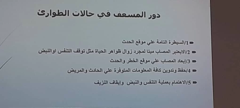 في إطار حرص قسم العلوم التربوية والنفسية على تنمية وتطوير مهارات الطالبات وتدريبهن على الإجراءات السريعة التي تتخذ في حالات الطوارئ (الإصابات، الحوادث، الحروق، أو الحالات الصحية). نظم ورشة عمل تدريبية بعنوان" مبادئ الإسعافات الأولية والطوارئ" وذلك يوم الأربعاء الموافق 4/12/2024 أشرفت عليها منسقة النشاط بالقسم وبمتابعة قسم النشاط بالكلية، بالتعاون مع شركة "بداية للتدريب والاستشارات"، حيث تم استضافة الدكتورة "مرام بن عيسى" لتقديم الورشة والتي تهدف إلى تدريب الطالبات على تقديم المساعدة والدعم الفوري لأنفسهم ولغيرهم والمحافظة على حياة المصاب وتقليل نسبة المخاطر حتى وصول المساعدة الطبية المتخصصة وتناولت الورشة الارشادات الأساسية التالية:
