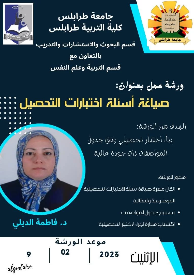 أعدت الدكتورة فاطمة ونظمت وقدمت ورشة عمل حول "صياغة أسئلة اختبارات التحصيل"، بالتعاون بين قسم التربية وعلم النفس وقسم البحوث والاستشارات والتدريب بالكلية. فعلت ذلك وهي غارقة في أداء ومتابعة واتقان مسؤلياتها الأخرى. أقيمت الورشة يوم الأثنين التاسع من فبراير 2023م بكلية التربية-طرابلس. هدفت الورشة إلى اكساب أعضاء هيئة التدريس مهارة "بناء امتحان تحصيلي وفق جدول المواصفات ذات الجودة العالية".