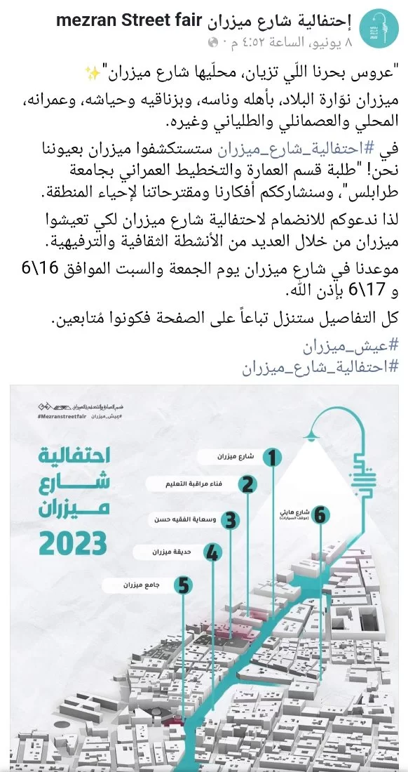 في احتفالية شارع ميزران ستكتشفون الشارع بعيون طلبة قسم العمارة. وتحت اشراف استاذ مادة التصميم الحضري الدكتور عدنان الحسنين. حيث يتخللها عدة أنشطه ثقافيه