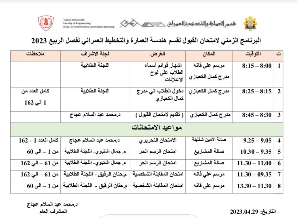 نعرض عليكم البرنامج الزمني لامتحان القبول بقسم العمارة والتخطيط العمراني لفصل الربيع 2023