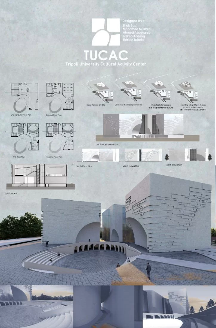 تم تكريم فريق جامعة طرابلس بقسم الهندسة المعمارية والذي تحصل على المركز الأول من قبل إدارة الجامعة بمسابقة التصميم المعماري والداخلي على مستوى الجامعات الليبية.وهم كلا من : احمد سالم ابوشارب. ايهاب ساسي الشوشان. محمد مصطفي عبد الحفيظ. فاطمة ابوالقاسم ابوساق. اخلاص فوزي طابلة. تحت إشراف:أ. مروان أبوزيانأ. أسامة عبد الهادي علي مجهوداتهم الطيبة في تصميم مركز ثقافي جامعي داخل الحرم الجامعي .