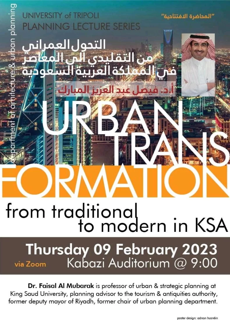 قام الدكتور عدنان حسنين عضو هيئة التدريس بقسم العمارة والتخطيط العمراني بتدشين سلسلة محاضرات في مجال التخطيط وذلك بالتواصل مع خبرات عربية ودولية في هذا المجال. وقد كانت أولى المحاضرات في يوم الخميس الماضي وذلك بمحاضرة للبروفيسور فيصل المبارك ( جامعة الملك سعود) لالقاء المحاضرة الافتتاحية . وقد شجع عرض د. فيصل الجمهور على التفكير في أوجه التشابه والاختلاف بين النهج السعودي والليبي في التخطيط.