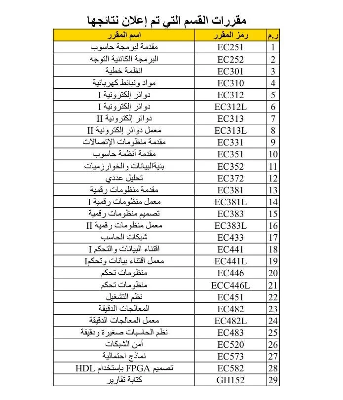 لتشجيع وتحفيز الطلاب المتميزين في القسم، بعد إعلان نتائج جميع مقررات القسم، تم نشر قائمة تضم الطلاب المتفوقين في كل مقرر دراسي خلال فصل خريف 2023. نهنئ هؤلاء الطلاب المتميزين على تفوقهم ونتمنى لهم استمرار النجاح والتفوق في مسارهم الأكاديمي.