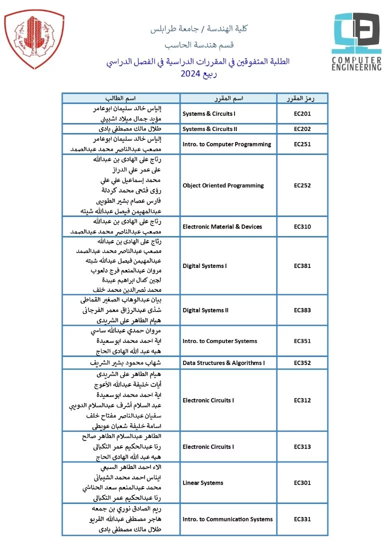 لتشجيع وتحفيز الطلاب المتميزين في القسم، وبعد إعلان نتائج مقررات القسم، تم إعداد قائمة تضم الطلاب المتفوقين في كل مقرر دراسي خلال الفصل الدراسي ربيع 2024. نهنئ هؤلاء الطلاب المتميزين على تفوقهم، ونتمنى لهم دوام النجاح والتفوق في مسيرتهم الأكاديمية.