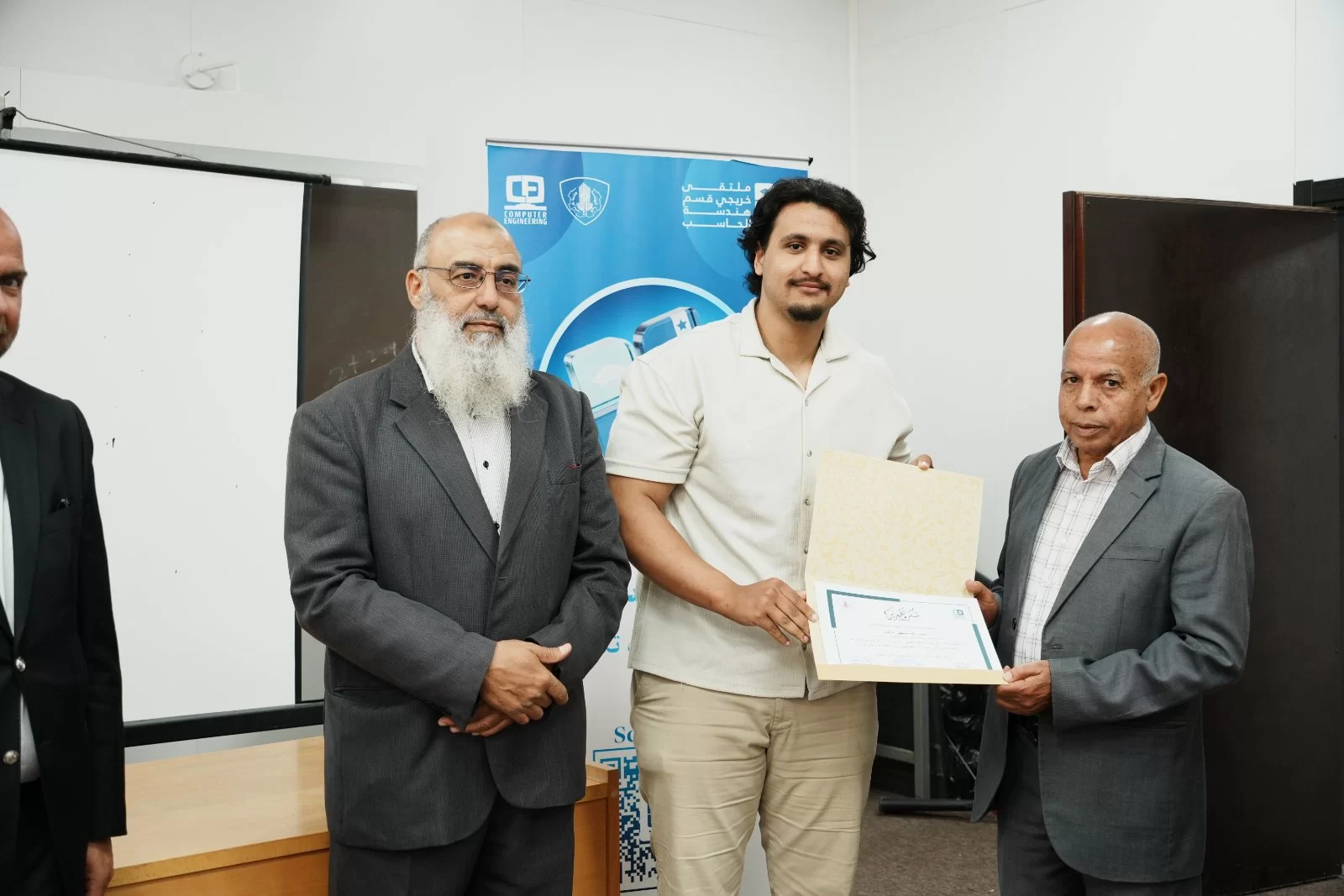 في إطار تقدير الجهود المبذولة لإنجاح الملتقى الأول لخريجي قسم هندسة الحاسب الذي انعقد يوم السبت الموافق 2026/4/4  ، قام كل من عميد كلية الهندسة، الأستاذ الدكتور سليمان الرقيبي، ,و رئيس قسم هندسة الحاسب الآلي الدكتور دخيل علي الجروالي  وبحضور الدكتور عبد السلام مادي،  رئيس قسم هندسة التعدين، بتكريم اللجنة المنظمة للملتقى وذلك عرفانًا بما قدموه من عمل متميز أسهم في تحقيق أهداف الملتقى وإخراجه بالصورة المشرفة. وقد ضمت اللجنة المنظمة للحدث أعضاء هيئة تدريس و خريجين ومن تعاون معها من موظفين وأعضاء مكتب شؤون الطلبة بالقسم.