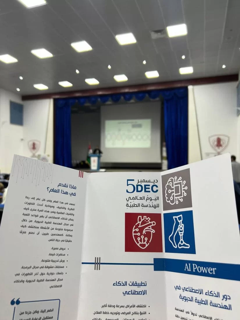 الإحتفال باليوم العالمي للهندسة الطبية الحيوية .افتتح الاربعاء مراسم الاحتفال باليوم العالمي للهندسة الطبية الحيوية بمسرح كلية الهندسة ، بحضور وكيل كلية الهندسة ولفيف من رؤساء الأقسام وأعضاء هيئة التدريس والطلبة .تضمن الحفل فقرات عدة منها عرض مرئي يوضح بدايات قسم الهندسة الطبية الحيوية ، من ثم عرض لأهمية الذكاء الاصطناعي في الهندسة الطبية الحيوية وتأثيره على تطور هذا المجال ، كما تم التعريف بأهمية عمل المهندس الطبي الحيوي في ليبيا من خلال عرض هيئة البحث عن المفقودين التي كانت راعي لهذا الحدث ، واختتم اليوم بتكريم الدكتور مفتاح البكوش على جهوده طوال العامين الماضيين منذ افتتاح القسم وأوائل الطلبة والمدربين المساهمين في ورش العمل .نشكر شركاءنا في نجاح هذا اليوم وهم هيئة البحث عن المفقودين وشركة النعمان للمعدات الطبية .