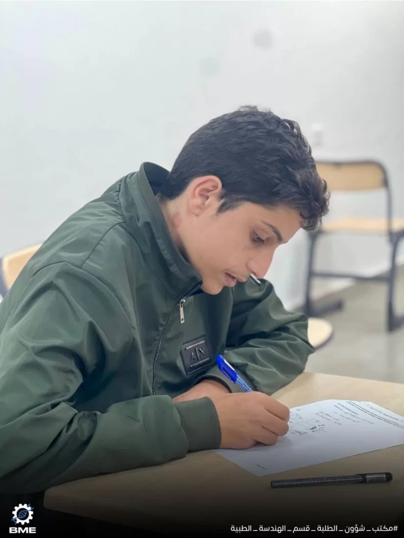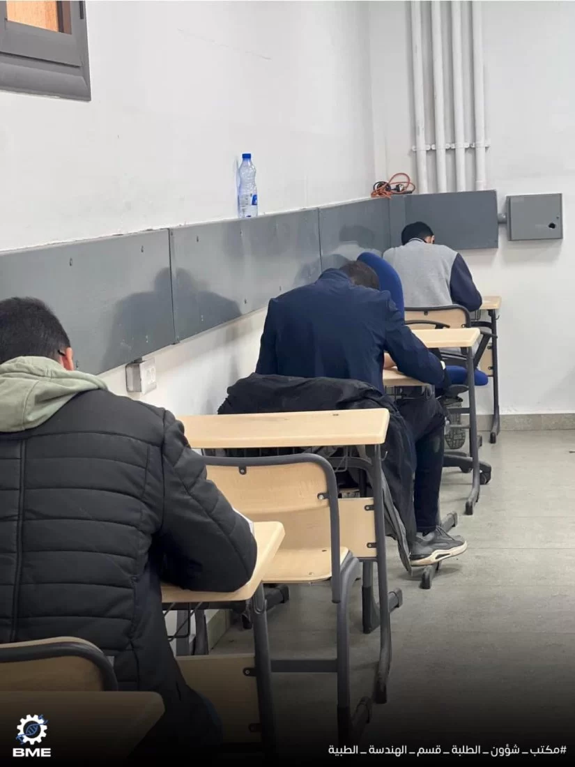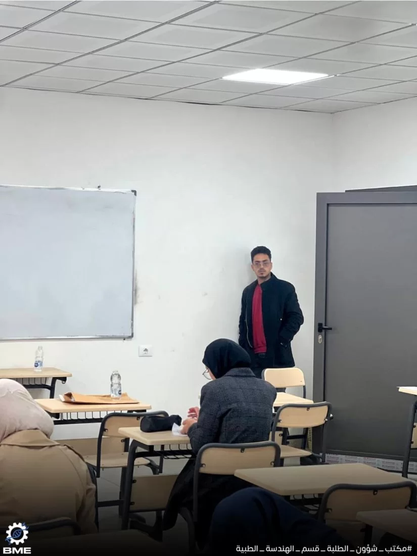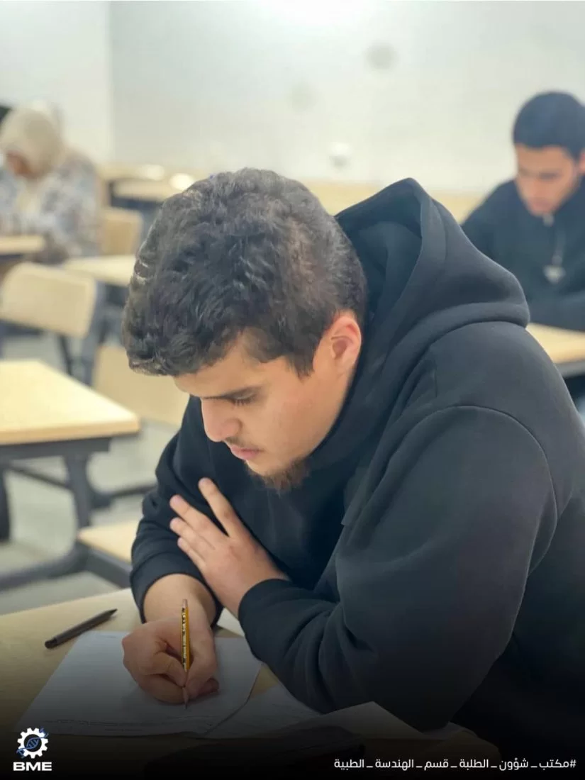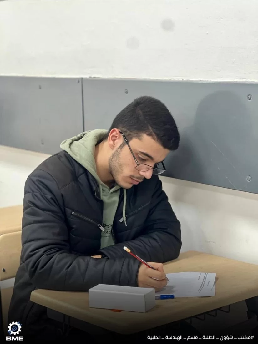 متابعة سير الامتحانات النصفية الثانية لطلبة قسم الهندسة الطبية الحيوية خريف 2024.انطلقت الامتحانات النصفية الثانية بقسم الهندسة الطبية الحيوية الأحد الموافق 15/12/2024 ولا تزال مستمرة طوال الأسبوع الجاري ، نتمنى لجميع الزملاء التوفيق في الامتحانات وأن تكون النتائج مبشّرة للجميع .