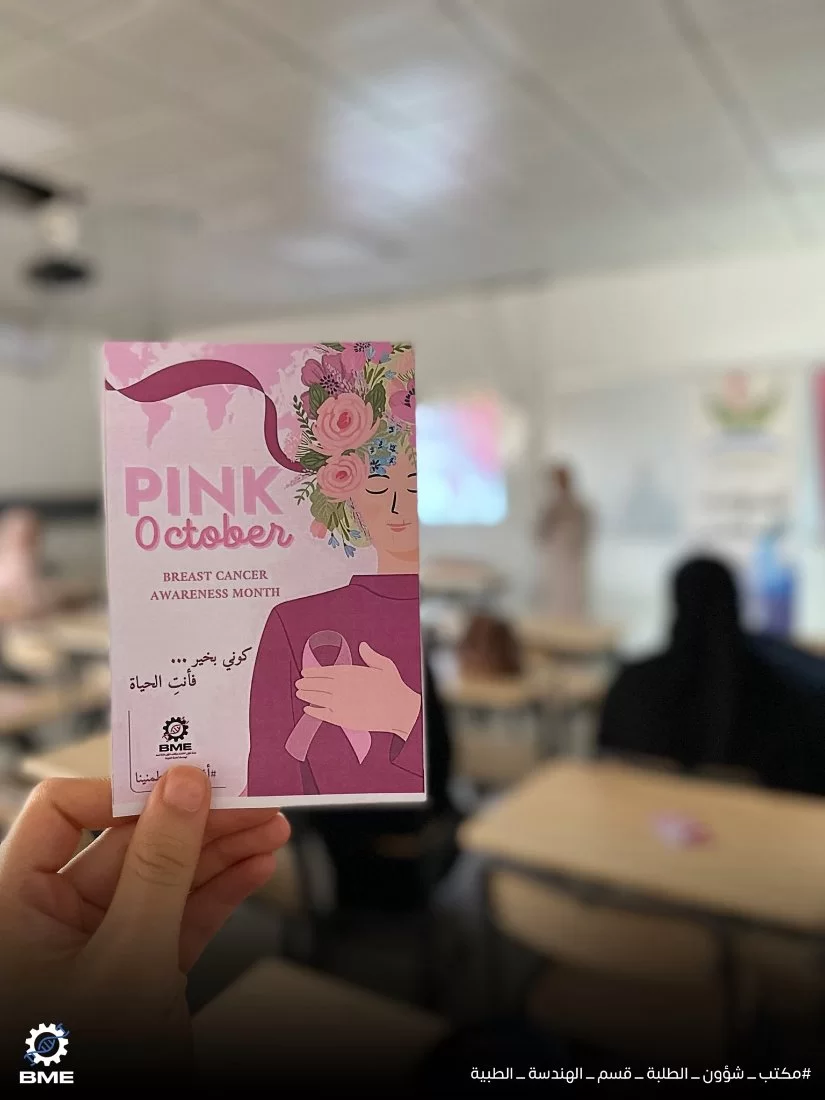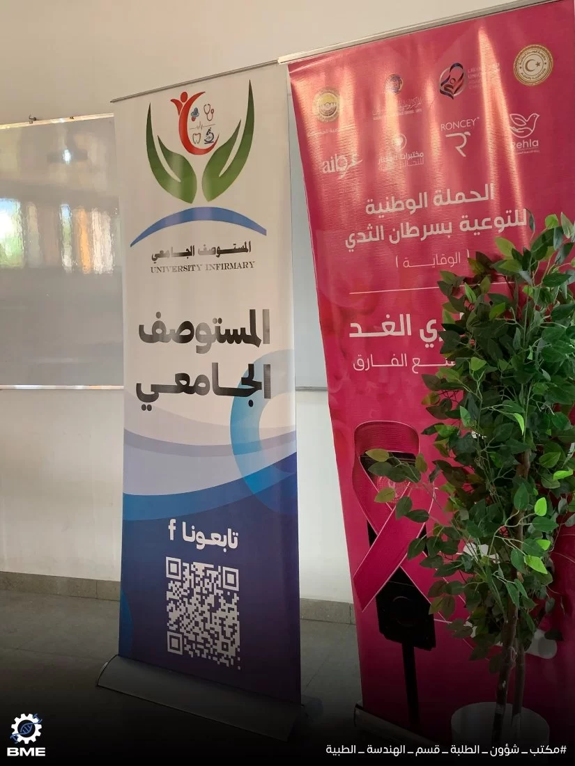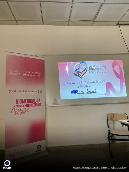 | محاضرة توعوية حول سرطان الثدي |نظّم مكتب شؤون الطلبة بقسم الهندسة الطبية الحيوية اليوم الاربعاء 5-11-2025 ، وبالتعاون مع المستوصف الجامعي -جامعة طرابلس، محاضرة توعوية بعنوان "مخاطر سرطان الثدي".تطرقت المحاضرة إلى أهم مراحل المرض وطرق الكشف الذاتي، بالإضافة إلى أبرز الأجهزة والتقنيات الطبية المستخدمة في التشخيص والعلاج.وقد جاءت هذه المبادرة ضمن جهود المكتب لتعزيز الوعي الصحي لدى الطلبة والمجتمع الجامعي. نشكر المستوصف الجامعي على تعاونه المثمر ومساهمته في إنجاح هذه الفعالية.