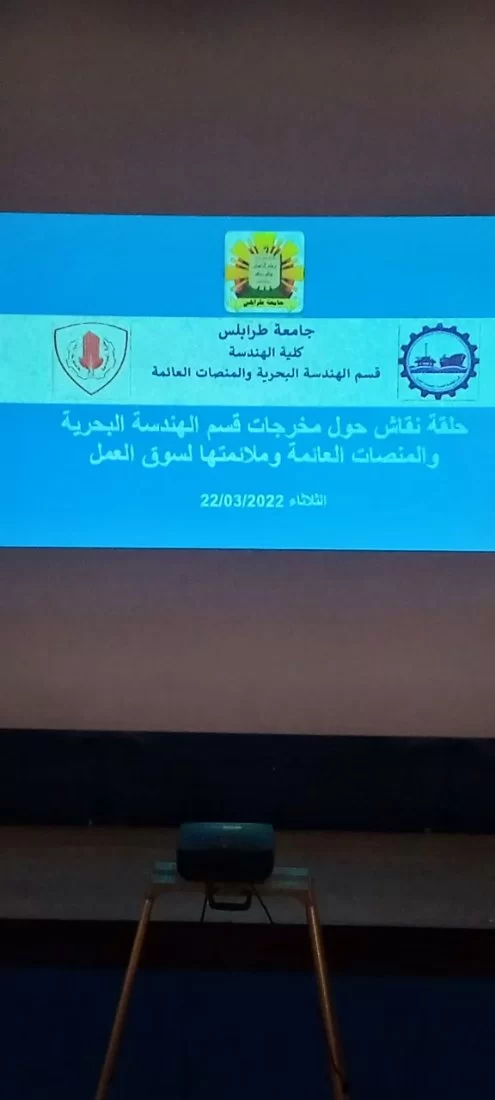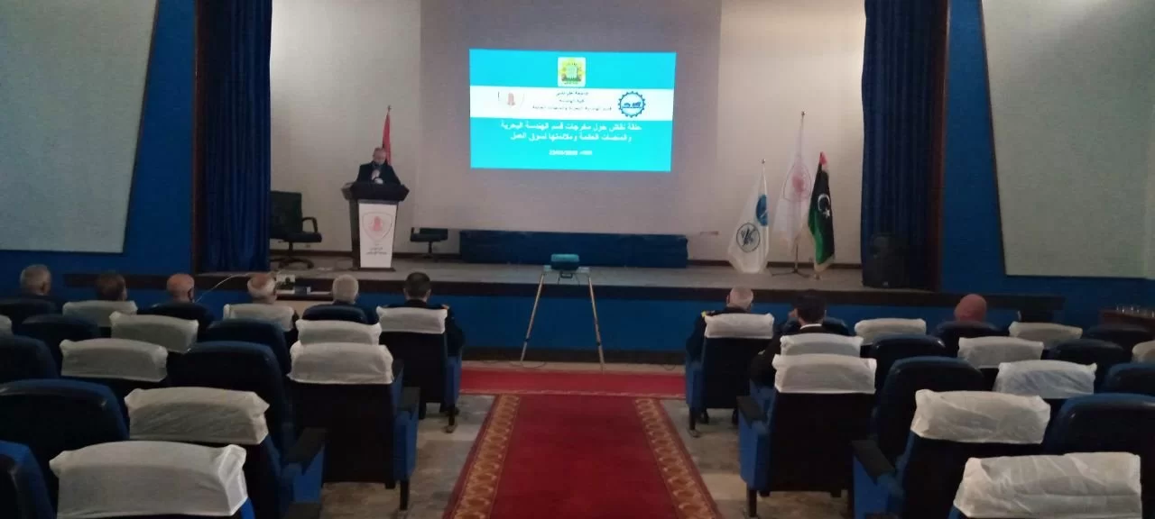 أقام قسم الهندسة البحرية اليوم الثلاثاء على تمام الساعة 10:00 صباحاً بمسرح كلية الهندسة بجامعة طرابلس حلقة نقاش بعنوان (سبل التعاون والتكامل بين القسم والمؤسسات البحرية) بمشاركة العديد من الجهات ذات العلاقة ومنها مصلحة المؤاني وحضر الورشة كل من رئيس الجامعة الدكتور خالد محمد عون والسادة الضيوف من مصلحة المواني ومن الأكاديمية البحرية، وكان برنامج الورشة كالتالي: كلمة الافتتاح من قبل رئيس القسم الدكتور محمد ضو، ثم كلمة من قبل رئيس الجامعة، والعرض التقديمي حول القسم ، بعد ذلك جلسة حوراية برائسة الدكتور فتحي ابوصاع والكتور نوري الشول تضمن المحاور التالية: