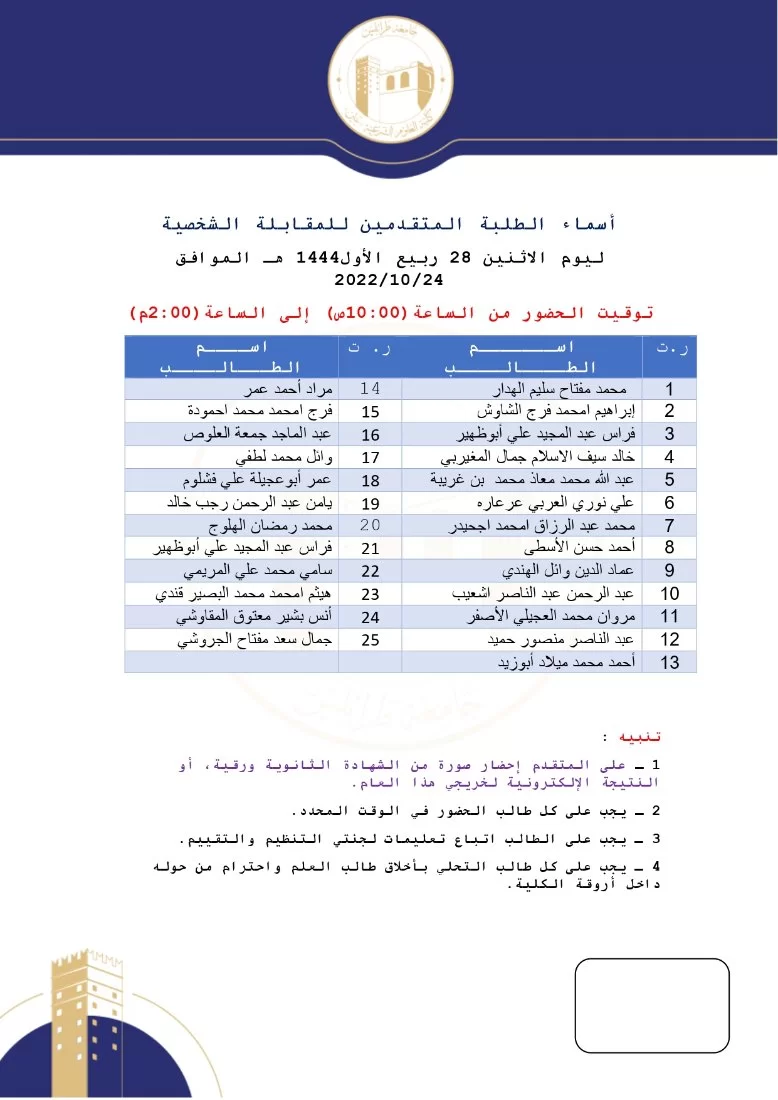 قوائم الأسبوع الأول بأسماء الطلبة المتقدمين للمقابلة الشخصية للقبول بكلية العلوم الشرعية - بنين - جامعة طرابلس.