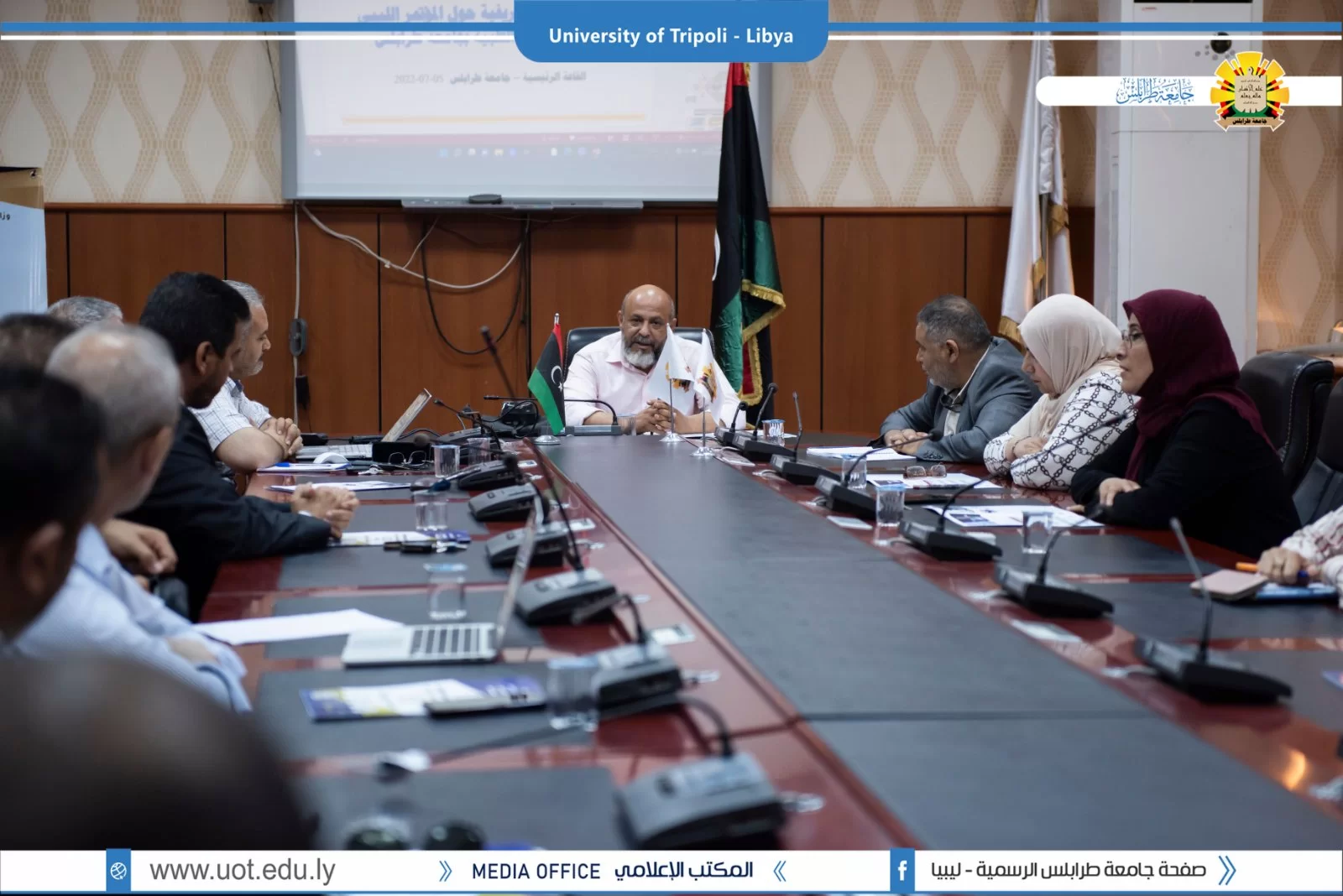 اجتمع السيد خالد غومة وكيل الجامعة للشؤون العلمية صباح اليوم الثلاثاء 5/7/2022 باللجنة التحضيرية العلمية للمؤتمر الوطني السابع للعلوم الطبية الذي سينعقد بتاريخ 11-13/ أكتوبر/ 2022 و ذلك بالتعريف عن المؤتمر و الأنشطة المصاحبة له، بذلك تدعو رئاسة جامعة طرابلس أعضاء هيئة تدريسها و طلبتها المشار