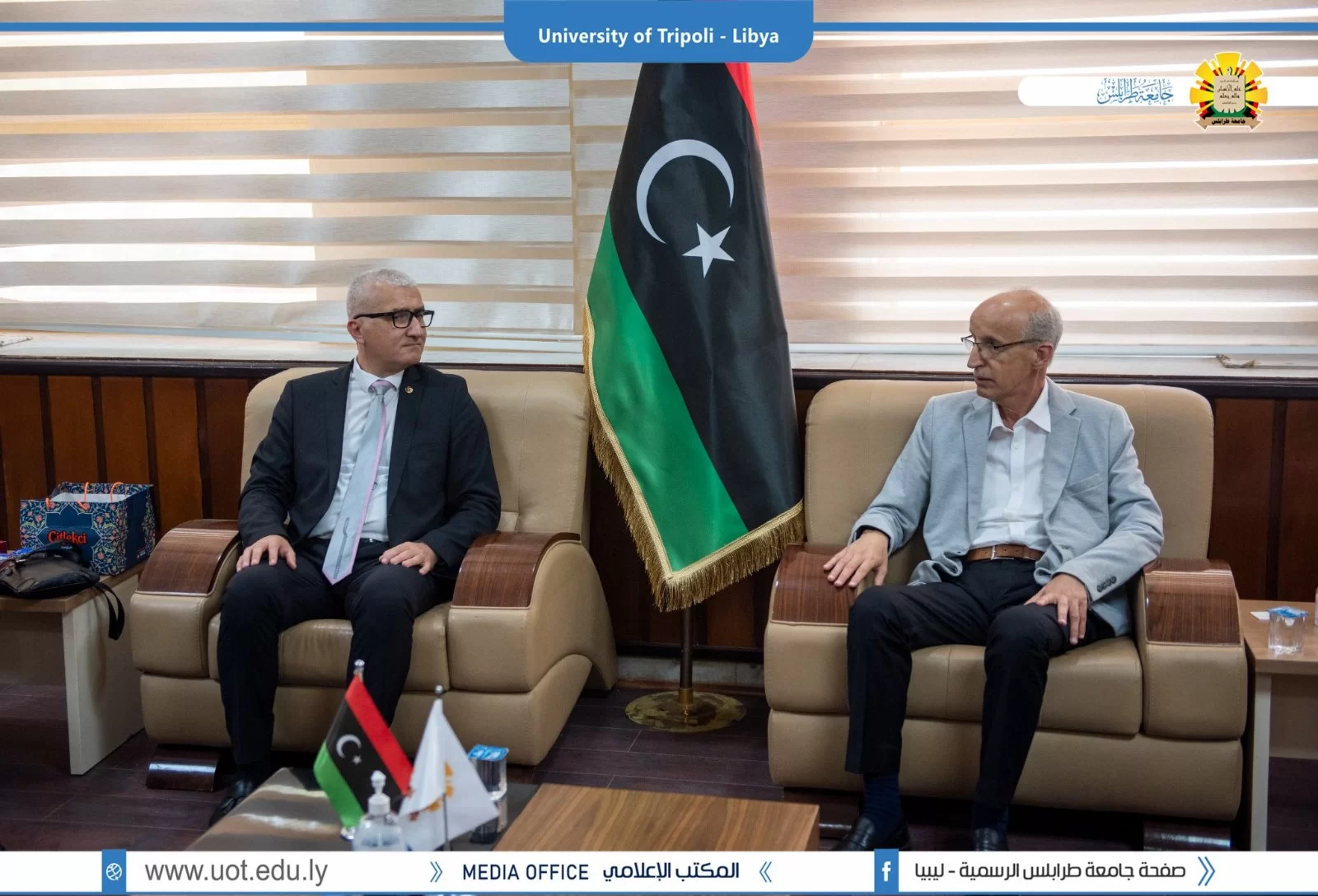 استقبل صباح اليوم الخميس السيد أ.د. خالد عون رئيس جامعة طرابلس رفقة السيد د. خالد غومة وكيل الجامعة للشؤون العلمية و السيد د. عادل ضياف مدير مكتب التعاون الدولي، وفد من معهد يونس أمره للثقافة التركية والذي ضم رئيس التدريب بالمعهد د. يافوز كارتالي أوغلو ومسؤول اللغة التركية السيدة أسيا أتالاي والسيد