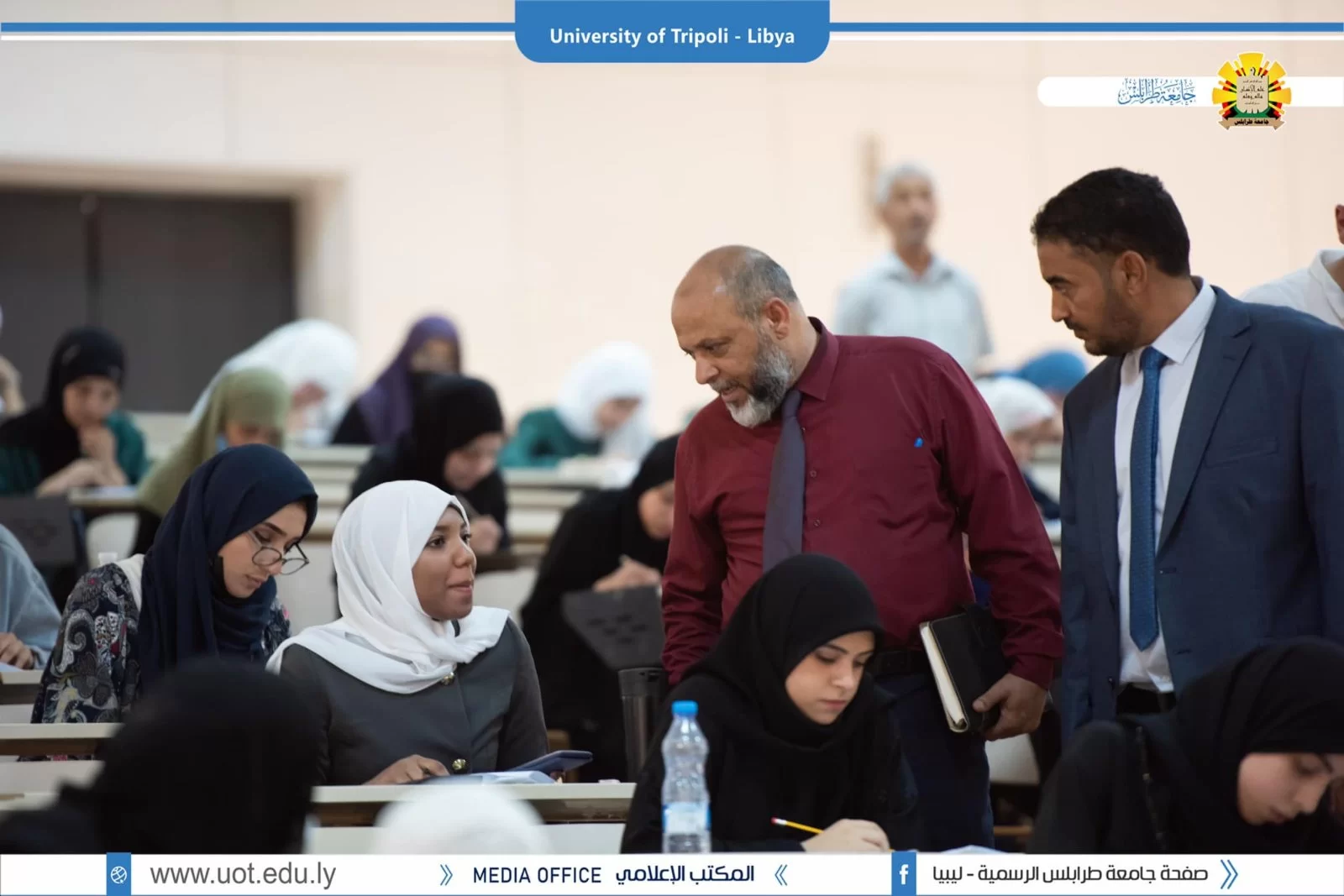 رئاسة جامعة طرابلس تتفقد الإمتحانات النصفية لطلبة المرحلة التمهيدية للعلوم التطبيقية طرابلس 28 مايو 2022 م قام السيد د. خالد غومة وكيل الجامعة للشؤون العلمية رفقة كل من د . ربيعة الغزيل منسقة المرحلة التمهيدية للعلوم التطبيقية و السيد د . علي مصدق المسجل العام بالجامعة و السيد أحمد ابورقيقة رئيس إتح