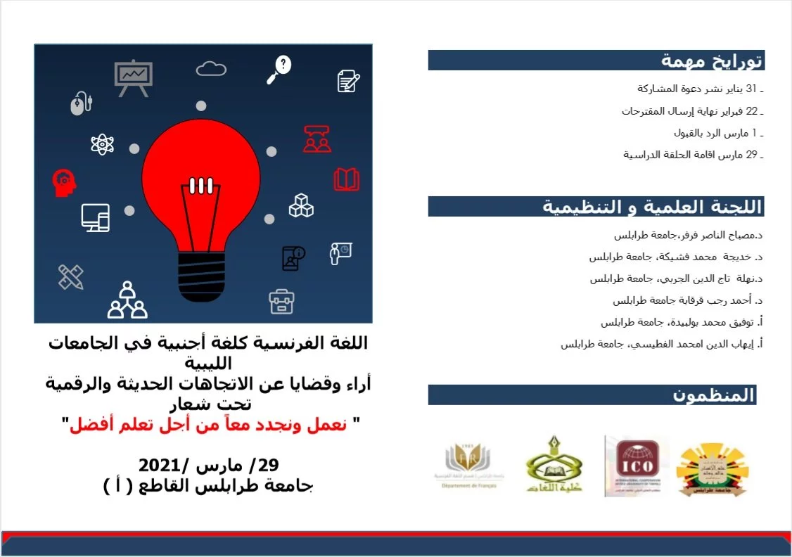 دعوة للمشاركة فى الحلقة الدراسية الثانية عن : اللغة الفرنسية كلغة اجنبية فى الجامعات الليبية أراء وقضايا عن الاتجاهات الحديثة والرقمية