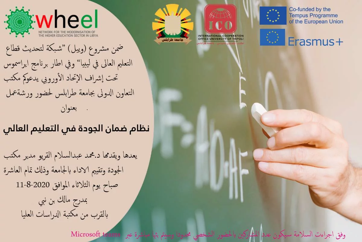 ضمن مشروع (وييل) “شبكة لتحديث قطاع التعليم العالى في ليبيا” وفي اطار برنامج ايراسموس+ تحت إشراف الإتحاد الأوروبي .يدعوكم مكتب التعاون الدولى بجامعة طرابلس لحضور ورشةعمل بعنوان: " نظام ضمان الجودة في التعليم العالي"يعدها ويقدمها د.محمد عبدالسلام القريو مدير مكتب الجودة