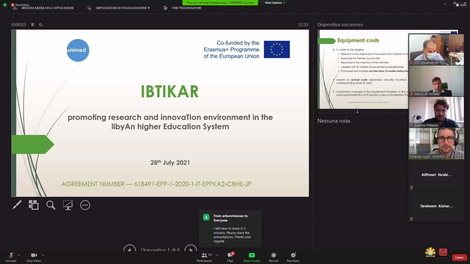 عقد صباح يوم الاربعاء 28-7-2021م عبر تطبيق الزوم الاجتماع التقابلى لجميع شركاء مشروع IBTIKAR , حيث حضر الاجتماع من جانب جامعة طرابلس كل من د.مدير مكتب التعاون الدولى و د. مدير مركز البحوث والاستشارات والتدريب بالجامعة. تدارس المجتمعون حزمة العمل المناطة بكل شريك من الشركاء. وقد قدمت جامعة طرابلس تقريرها فيما يخص تقييم واقع مراكز البحوث والاستشارات والتدريب بالجامعات الليبية .الجدير بالذكر أن المشروع يجمع في شراكته عشر جامعات ليبية وثلاث جامعات أوروبية و يهدف لدعم مراكز البحوث والبحث العلمى بالجامعات الشريكة و هو ياتى ضمن مشاريع رفع القدرات ( ايراسموس بلس) ومدعوما من الاتحاد الاوروبي.