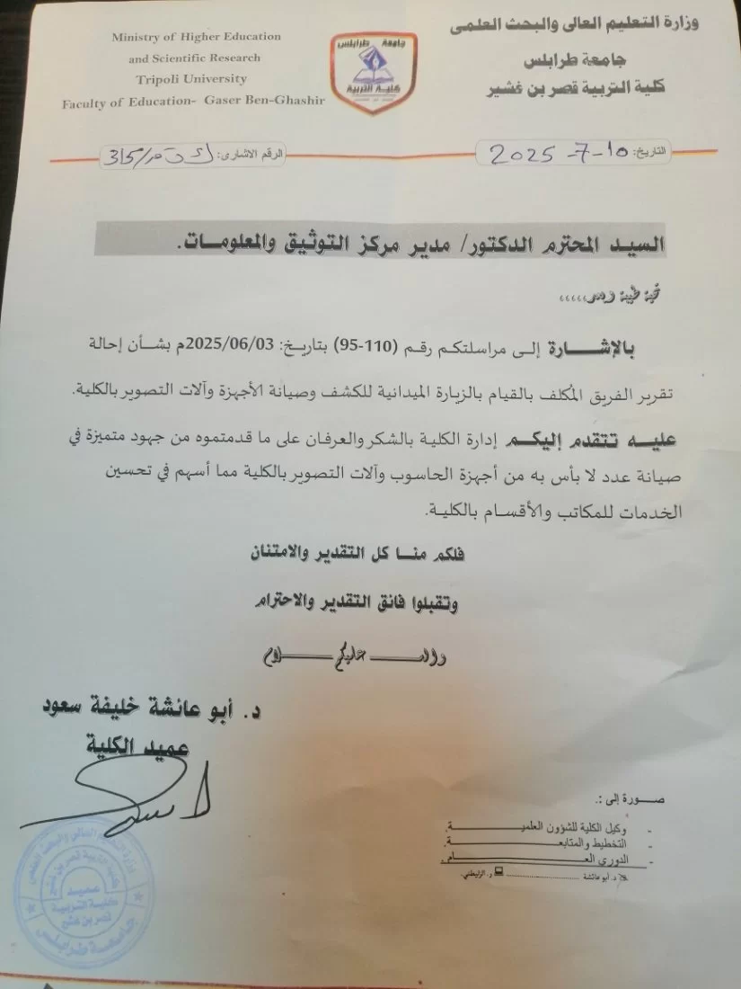 عرفانًا منها بالجهد المبذول من مركز المعلومات والتوثيق في عملية الصيانة الدورية التي يقوم بها المركز، قامت كلية التربية قصر بن غشير بتقديم رسالة شكر لإدارة المركز.وقد أعربت إدارة الكلية في رسالتها عن امتنانها العميق للدور الفعّال الذي يقوم به المركز، مما ساهم بشكل كبير في تعزيز كفاءة العمل