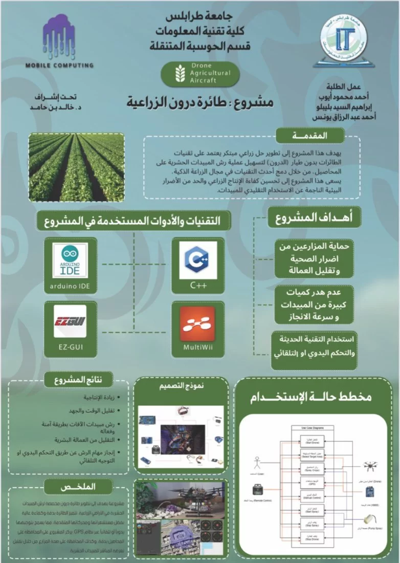 3- طائرة الدرون الزراعية - نظام رش النباتات بالمبيد الحشري بطريقة أمنة وفعالة، تحت اشراف الأستاذ الفاضل: د.خالد بن حامد، ومن إعداد الطلبة: