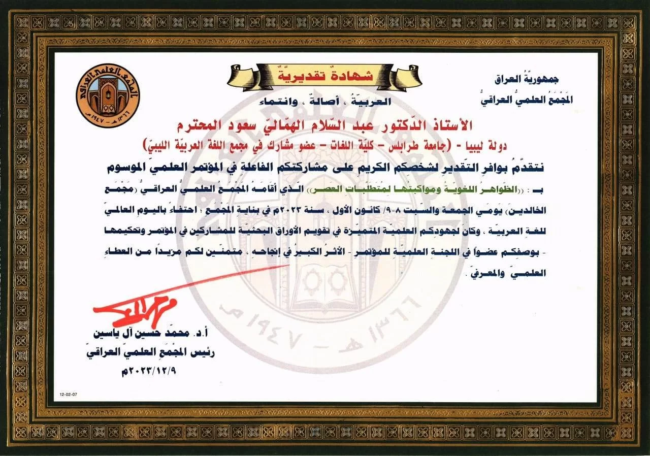 شارك أ.د. عبد السلام الهمالي سعود، أستاذ الأدب العربي القديم بكلية اللغات، في المؤتمر العلمي (الظواهر اللغوية ومواكبتها لمتطلبات العصر) الذي أقامه المجمع العلمي العراقي، خلال يومي 8 و 9 / 12 / 2023م، بمناسبة اليوم العالمي للغة العربية.