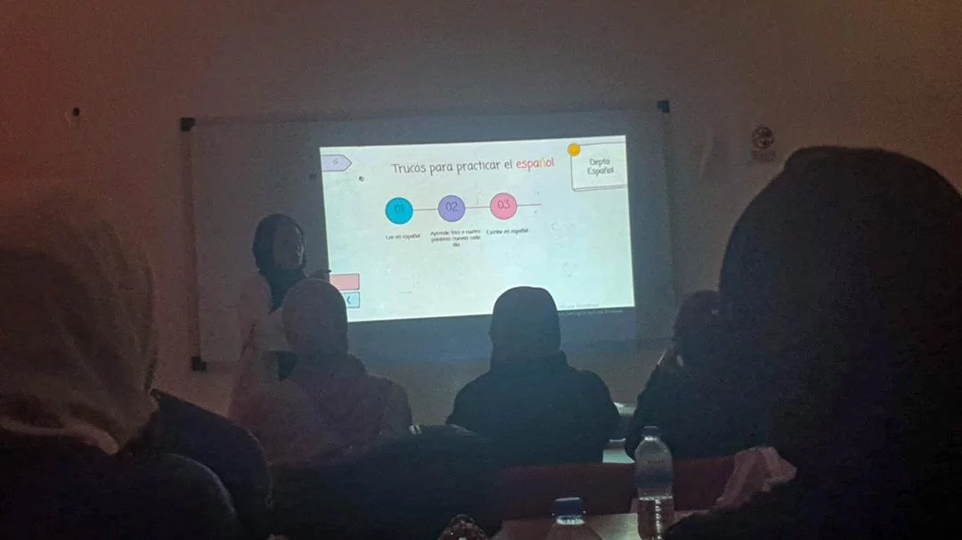 ضمن النشاطات التي يقوم بها قسم اللغة الإسبانية، اقيم يوم الإربعاء الماضي عرض مرئي بالقاعة 17 بالقسم، تم من خلاله توضيح اهمية اللغة الإسبانية وتعلمها مؤخرا، واهمية النشاطات الثقافية والعلمية في تطوير المستوى التعليمي للطالب، بحضور طلبة القسم والأخوة أعضاء هيئة التدريس. هذا وقامت الأستاذة/ ندى عطية بتقديم ملخص للطلبة حول اهمية اللغة الإسبانية في العالم، واهمية تعلمها مؤخرا، واستعرضت بعض الطرق العلمية التي من شأنها تسهيل عملية الفهم والإستيعاب لدى الطالب وتحسين مستوى اللغة لديه. كما تطرقت لأهم المخارج المهنية والعلمية بعد إنهاء المرحلة الدراسية. كما قام السيد/ رئيس القسم بالتحدث حول ابرز النشاطات الثقافية والعلمية التي سيشرع القسم في القيام بها خلال الفترة القادمة مستعرضا اهم النشاطات الثقافية التي قام بها طلبة القسم خلال السنوات الأخيرة، وشدد على ضرورة مشاركة جميع طلبة القسم بهذه النشاطات التي من شأنها ان تلعب دورا مهما في تطوير العملية التعليمية بالقسم وتمكن الطالب من تحسين مستواه العلمي والأكاديمي.