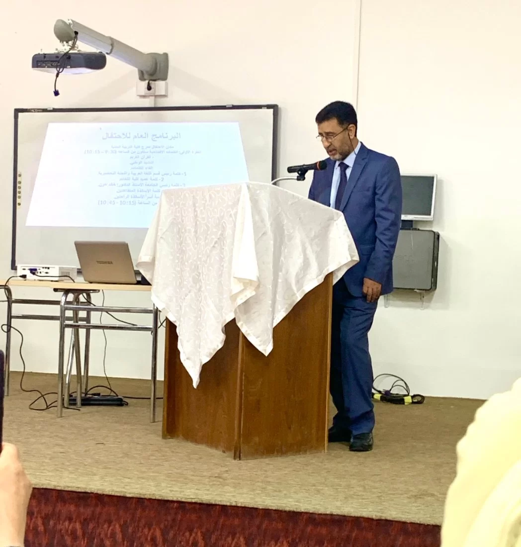 افتتحت الفقرة بآيات من الذكر الحكيم،تلاها الطالب فرج ابو خريص، ثم الوقفة مع النشيد الوطني، ثم كلمة عمادة الكلية قدمها السيد رئيس قسم اللغة العربية د. مفتاح ناجي، ثم كلمة الأساتذة المتقاعدين قدمها أ.د رمضان سعد القماطي ، وقدم أ.د نوري عبيريد كلمة لأسر الأساتذة الراحلين .