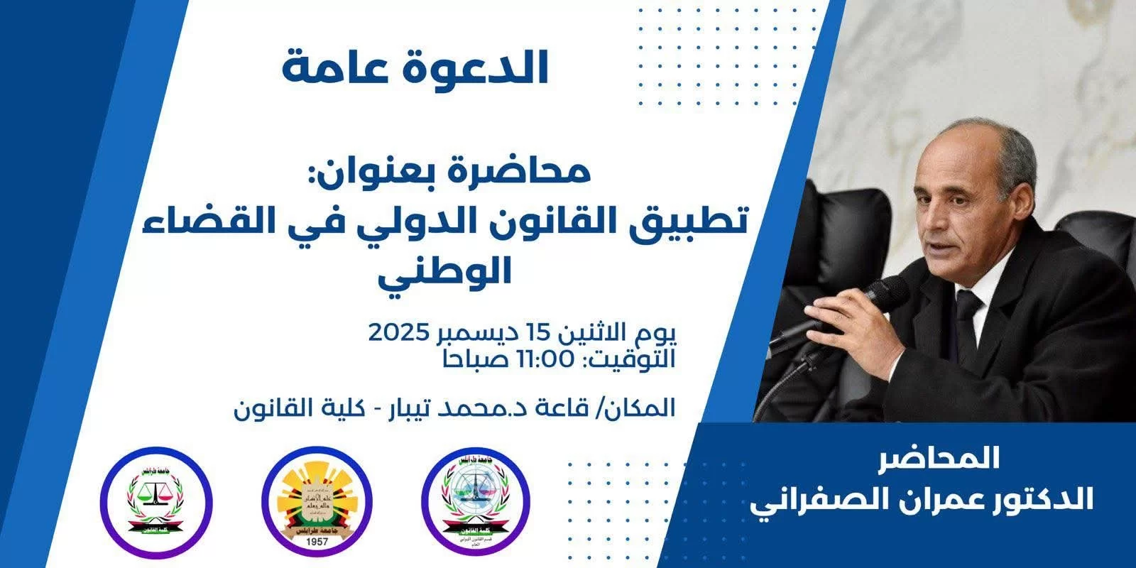 أُقيمت صباح اليوم الاثنين الموافق 15 ديسمبر 2025، بقاعة المؤتمرات بالمبنى الإداري لكلية القانون – جامعة طرابلس، المحاضرة الربع سنوية الأولى لقسم القانون الدولي العام، تحت عنوان «تطبيق القانون الدولي في القضاء الوطني»، والتي قدّمها الأستاذ الدكتور عمران الصفراني، وذلك بحضور عميد كلية القانون الدكت