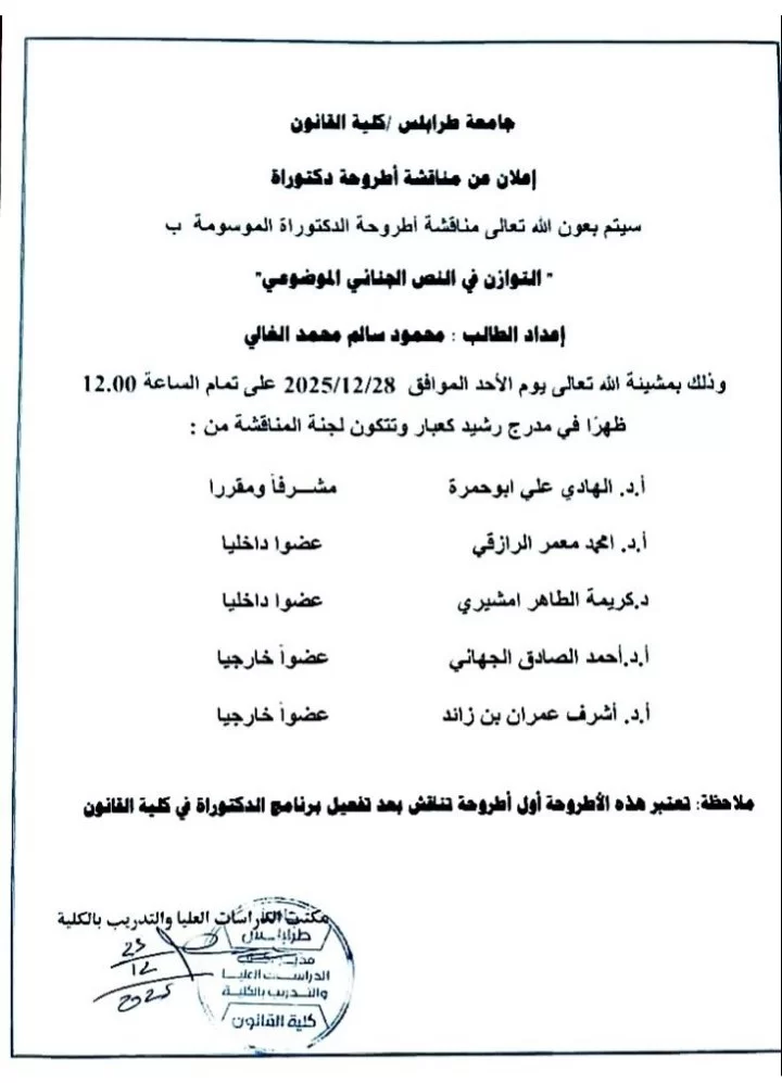 تتشرف كلية القانون بالإعلان عن مناقشة أول أطروحة دكتوراه بعد إعادة تفعيل برنامج الدكتوراه بالكلية، وذلك يوم الأحد الموافق 28 ديسمبر 2025، في تمام الساعة 12:00 ظهرًا، في مدرج رشيد كعبار..الأطروحة مقدمة من الأستاذ محمود سالم محمد الغالي، عضو هيئة التدريس بقسم القانون الجنائي، تحت عنوان: «الت