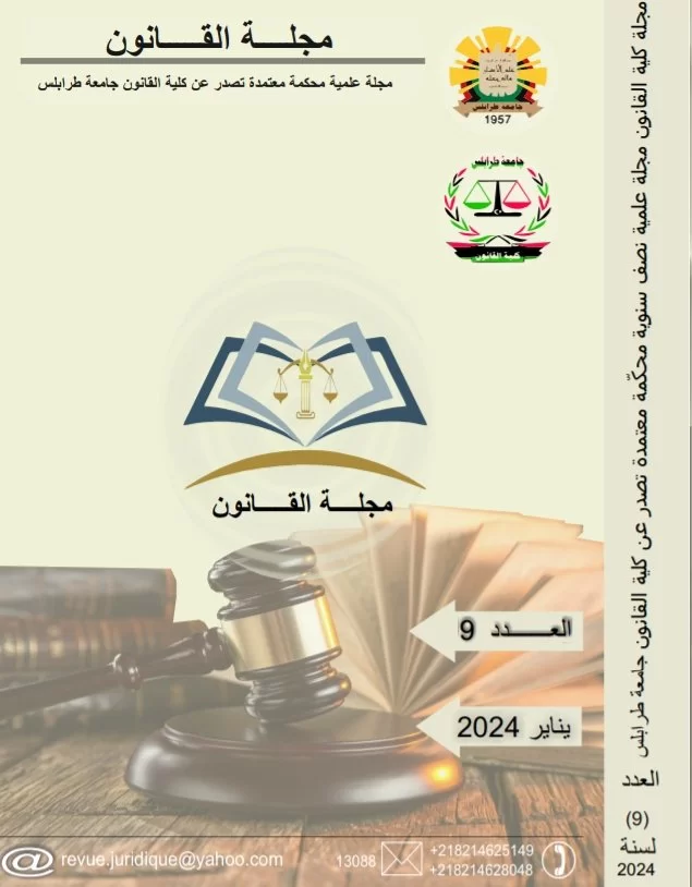 تعلن هيئة تحرير مجلة القانون جامعة طرابلس عن صدور العدد التاسع يناير 2024 م،، والذي جاء زاخرا بالعديد من الأبحاث العلمية في مختلف فروع القانون، وذلك بواقع سبعة عشر بحثا علميا..وبهذه المناسبة،تأمل هيئة التحرير أن يلقى هذا العمل العلمي صدى وقبول في أوساط القانونيين، وأن تكون هناك مشارك