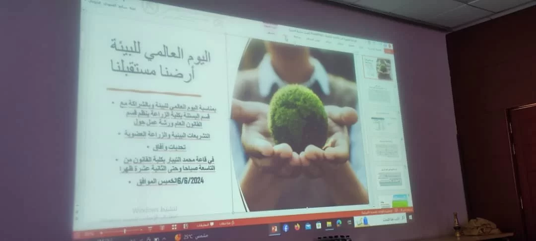 بمناسبة اليوم العالمي للبيئة وتحت شعار (أرضنا مستقبلنا) وفي رحاب كلية القانون، نظم قسم القانون العام ومكتب خدمة المجتمع والبيئة بالكلية بالشراكة مع قسم البستنة بكلية الزراعة، ورشة عمل حول (التشريعات البيئية والزراعة العضوية تحديات وآفاق) ...تم خلال الورشة طرح و مناقشة عدة محاور قانوني