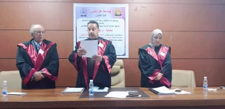 This morning, Saturday, 09/23/2023, a master’s thesis was discussed in the Department of Public Law, by student Howaida Milad Al-Zarqani, entitled ((The legal system for judicial fees in Libyan law)). The thesis was approved with an excellent grade and the student was awarded a master