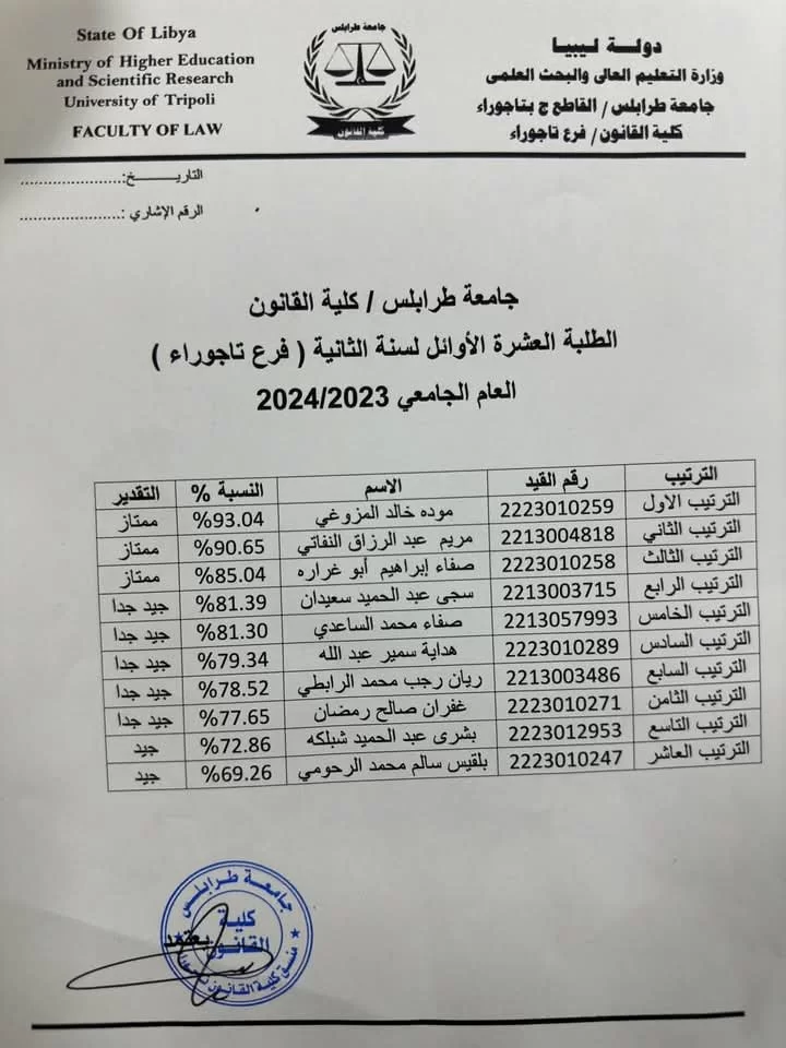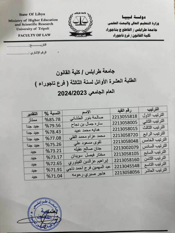 أعلن قسم الدراسة و الامتحانات بكلية القانون تاجوراء القاطع ج ، قوائم الطلبة الأوائل للسنوات الدراسية الأولى والثانية والثالثة، للعام الجامعي 2023-2024م.