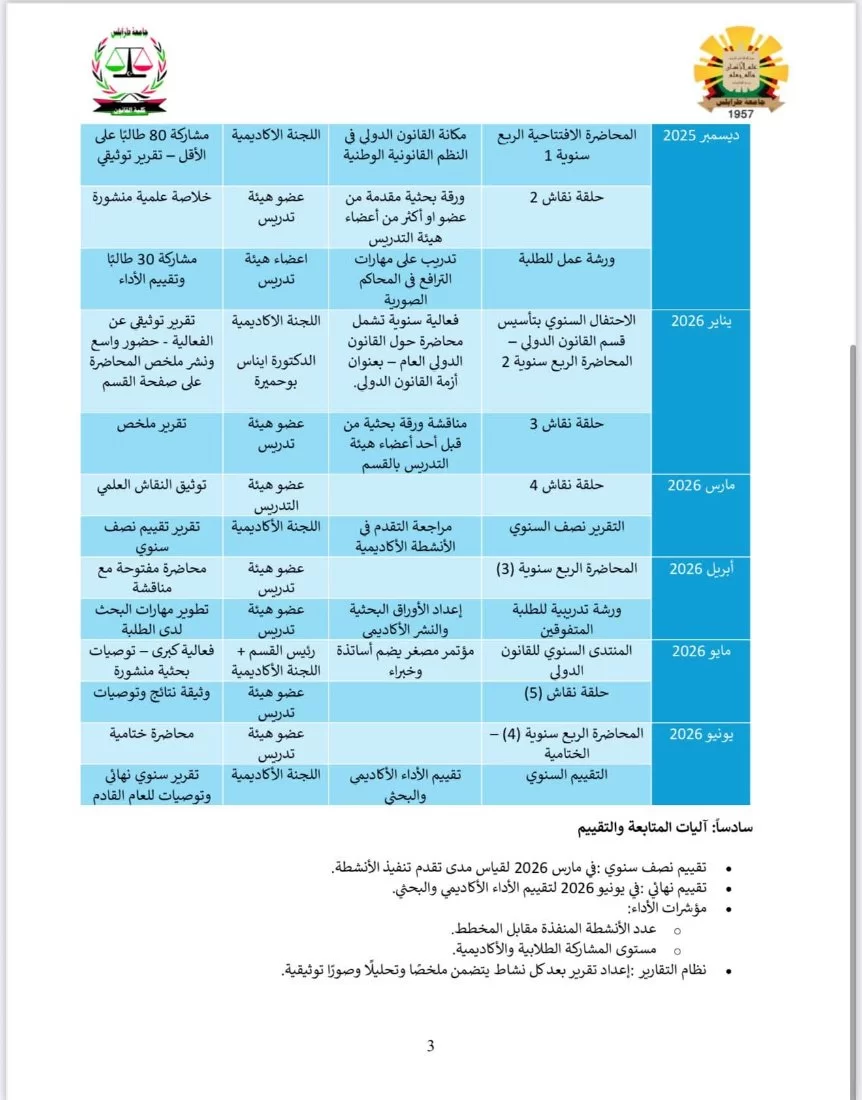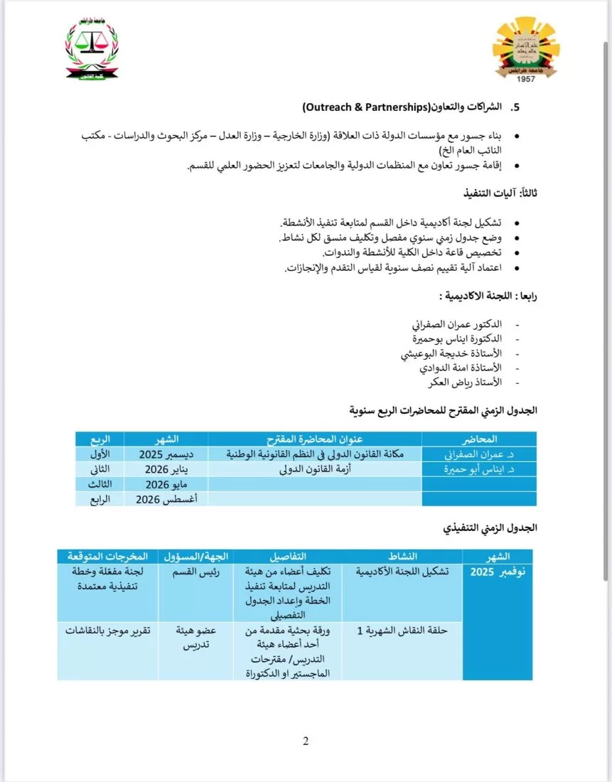 يسُرّ قسم القانون الدولي بكلية القانون – جامعة طرابلس أن يعلن رسميًا عن إطلاق خطته الأكاديمية للعام الجامعي 2025/2026، إيذانًا ببدء مرحلة جديدة من العمل العلمي المنهجي الهادف إلى الارتقاء بجودة التعليم وتعزيز مكانة القسم على المستويين الوطني والإقليمي.
