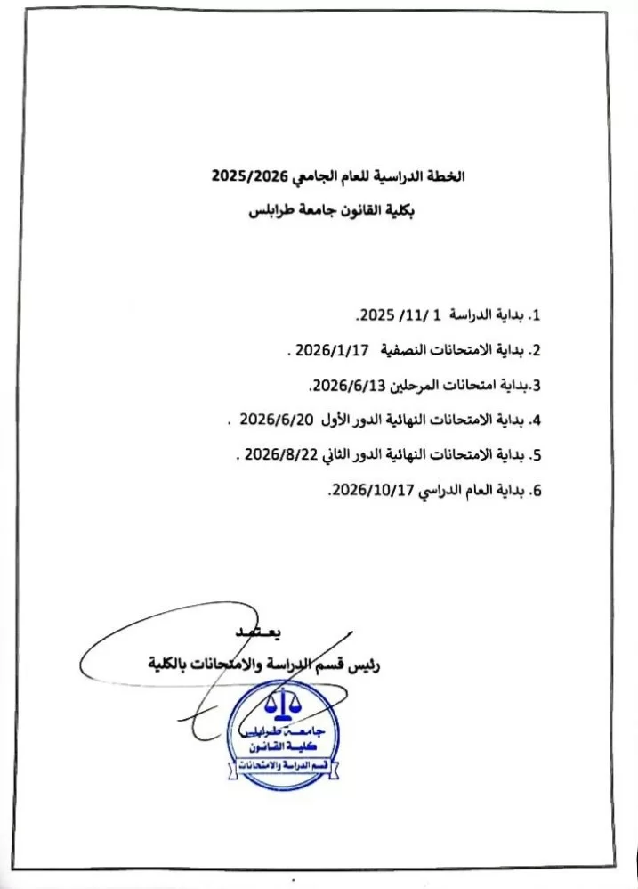 أعلنت إدارة كلية القانون بجامعة طرابلس مساء اليوم الأربعاء الموافق 10 ديسمبر 2025 عن الخطة الدراسية للعام الجامعي 2025/2026، وذلك حرصًا منها على تنظيم العملية التعليمية وضمان سيرها بكفاءة وفعالية، وتعزيز جاهزية الطلاب لأداء الامتحانات النصفية والنهائية وفق المواعيد المحددة مسبقًا.