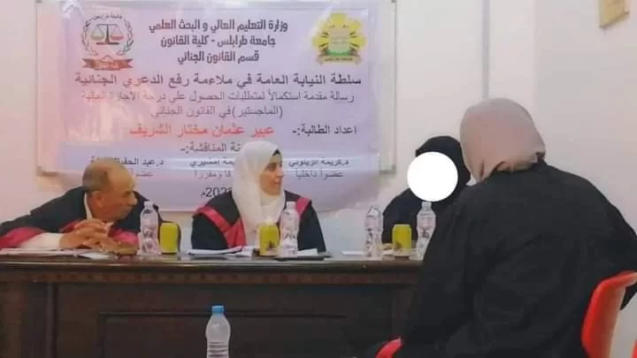 تم يوم الخميس الماضي مناقشة رسالة ماجستير في القانون الجنائي المقدمة من الطالبة عبير عثمان الشريف، عنوانها "سلطة نيابة النيابة العامة في ملاءمة رفع الدعوى".