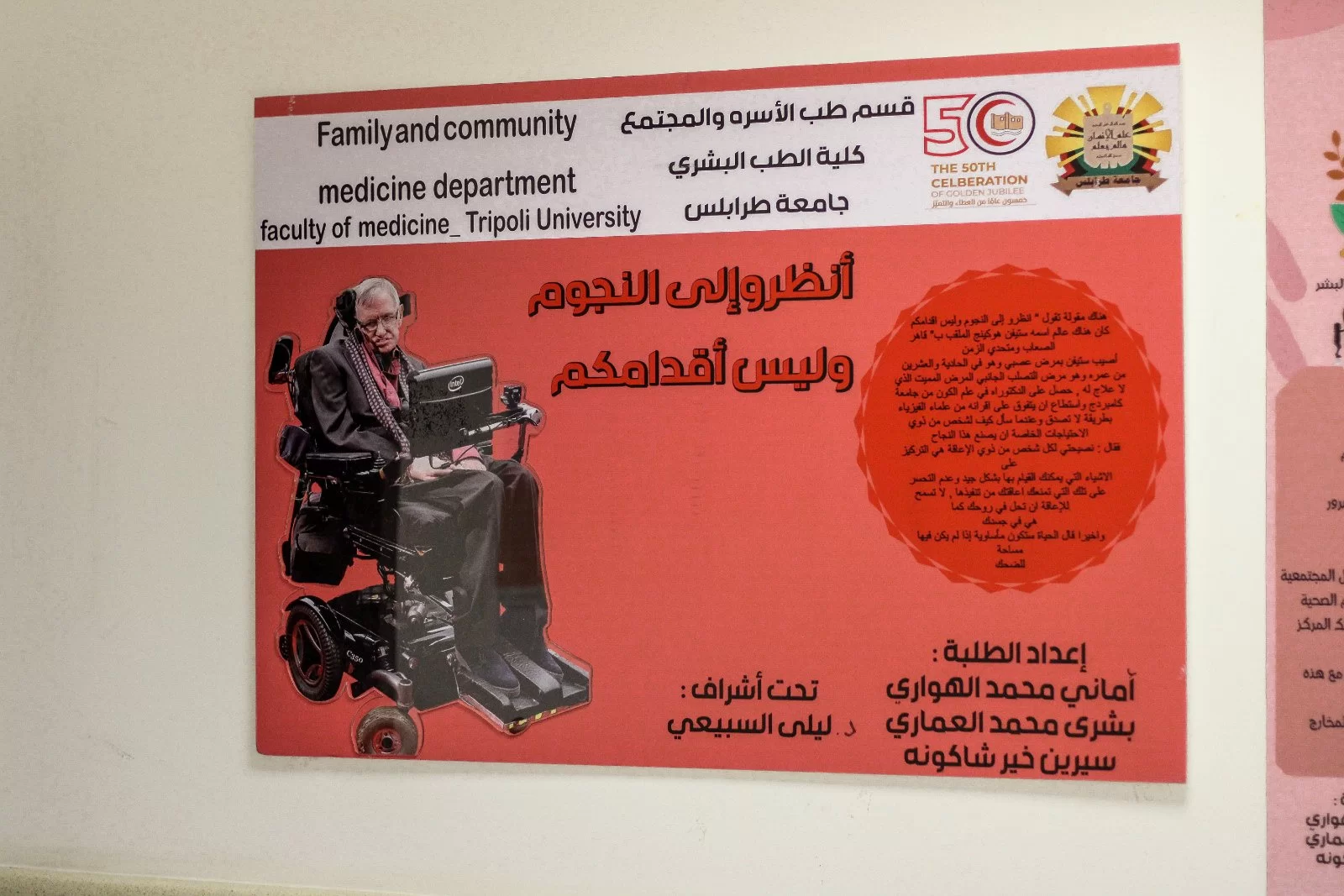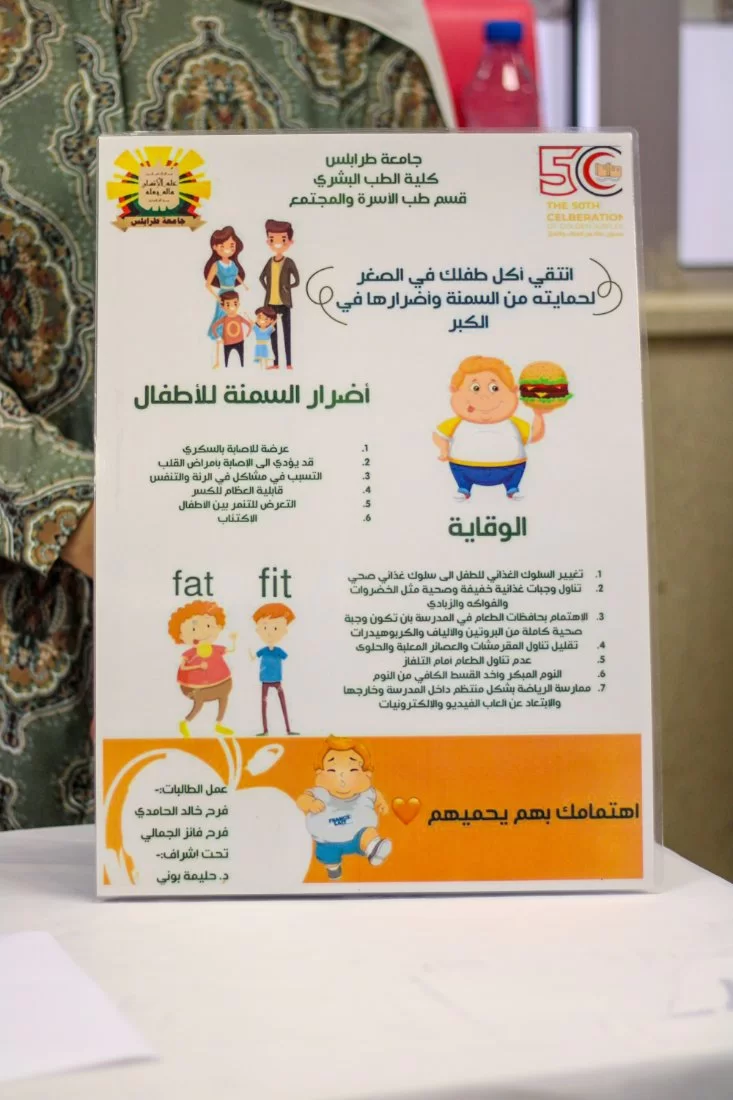 أقيم يوم الإربعاء معرض التثقيف الصحي الثالث لطلبة قسم طب الأسرة والمجتمع الذي كان بحضور وكيل كلية الطب البشري وأعضاء هيئة التدريس والمعيدين بالقسم حيث قام إتحاد طلبة كلية الطب البشري بتنظيم هذا المعرض تحت رعاية ودعم مستشفى غوط الشعال التخصصي وشركة مودرن هوم