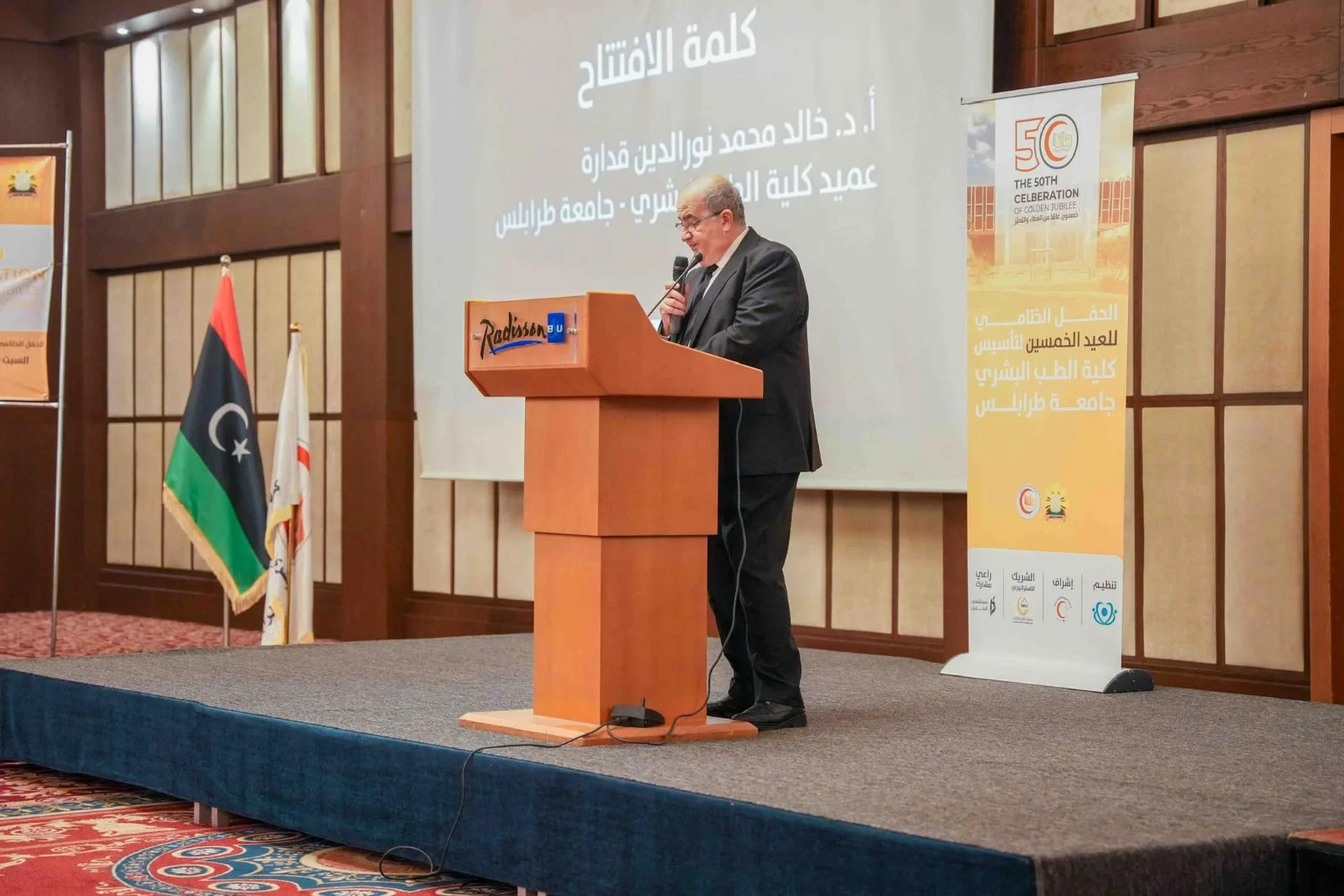 أقيم صباح يوم الأمس السبت الحفل الختامي للعيد الخمسين لتأسيس كلية الطب البشري بجامعة طرابلس، وقد افتتح الحفل السيد عميد الكلية "أ. د. خالد قدارة" مرحبًا بالضيوف الكرام، ثم كلمة للنقيب العام لأطباء ليبيا "د.