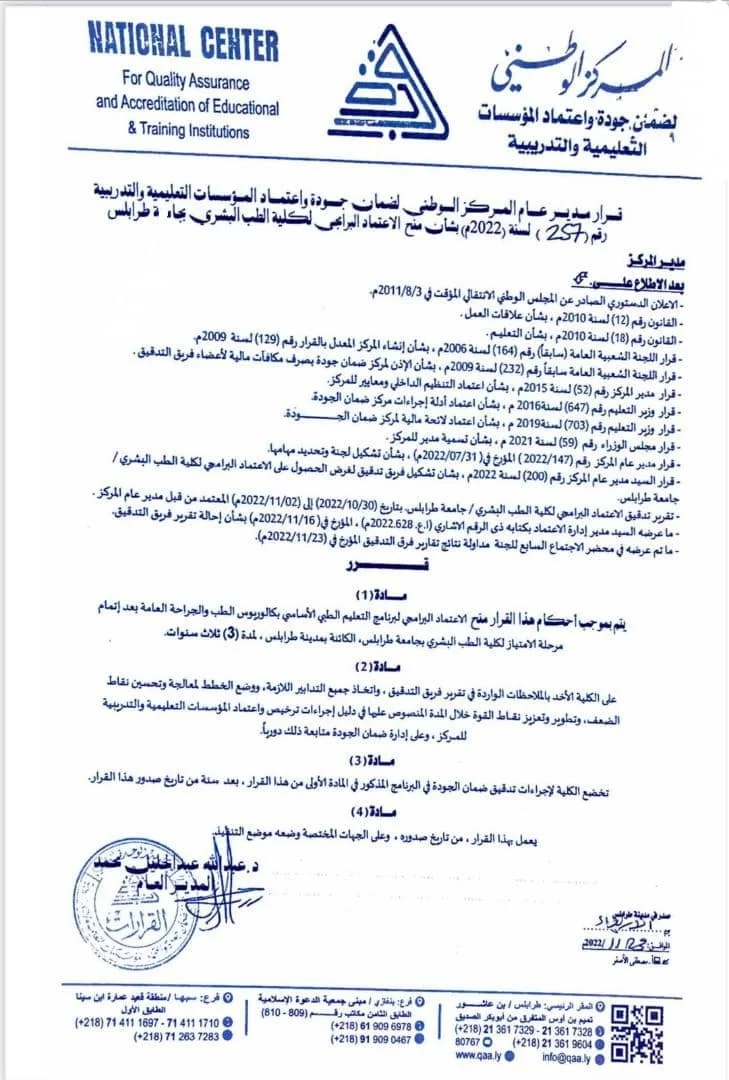 The Faculty of Medicine was established in 1973, Tripoli, to contribute in qualifying medical personnel. The Faculty graduated its first batch in 1980.