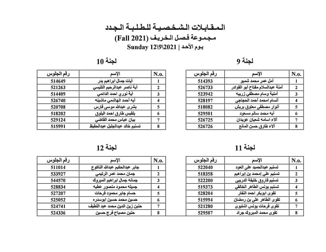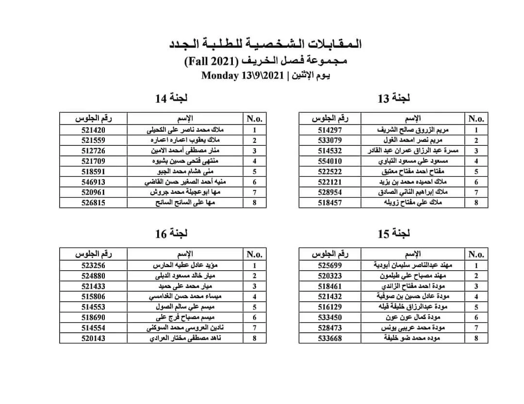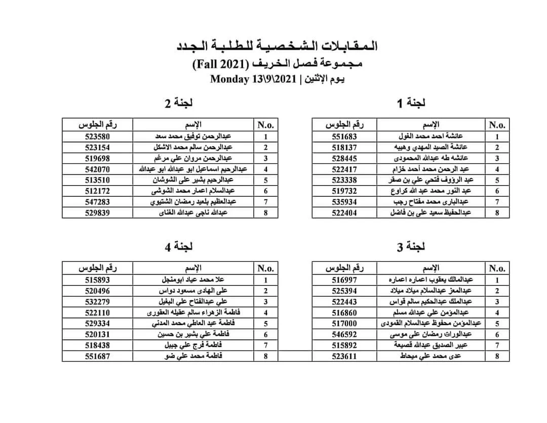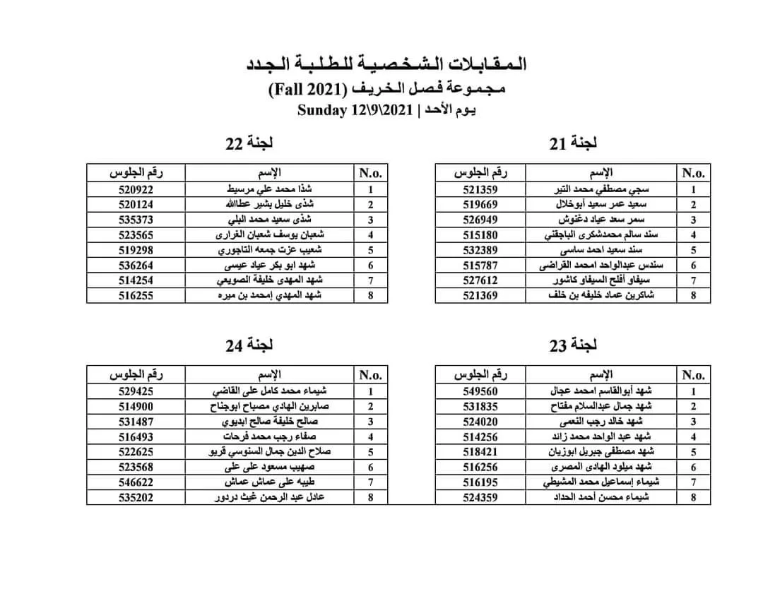 قوائم المقابلة الشخصية للطلبة الجدد فصل خريف 2021
