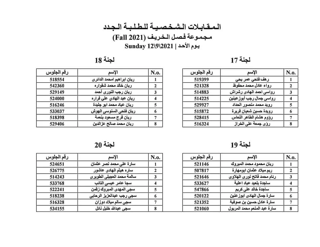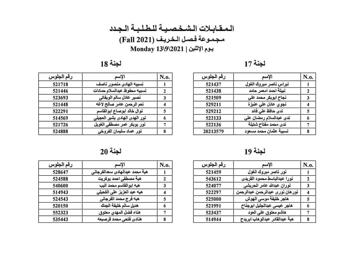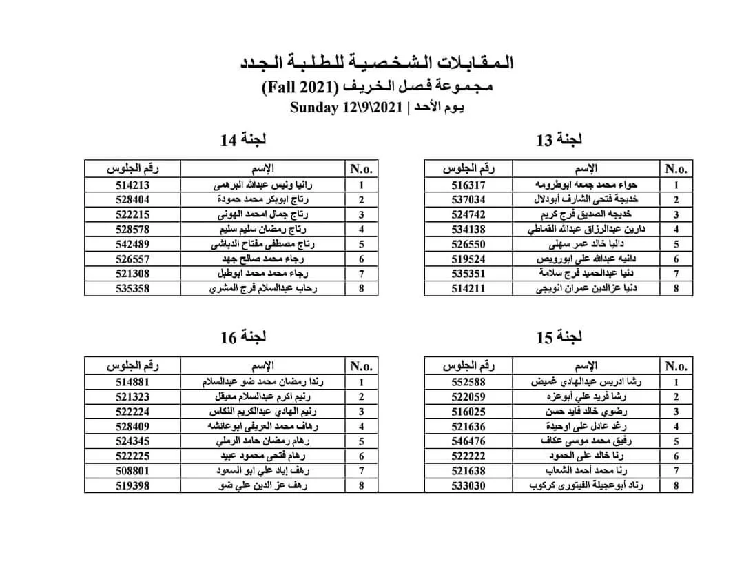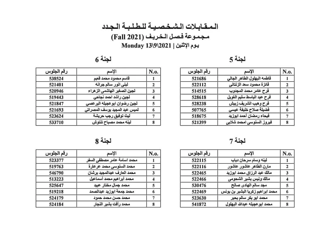 قوائم المقابلة الشخصية للطلبة الجدد فصل خريف 2021