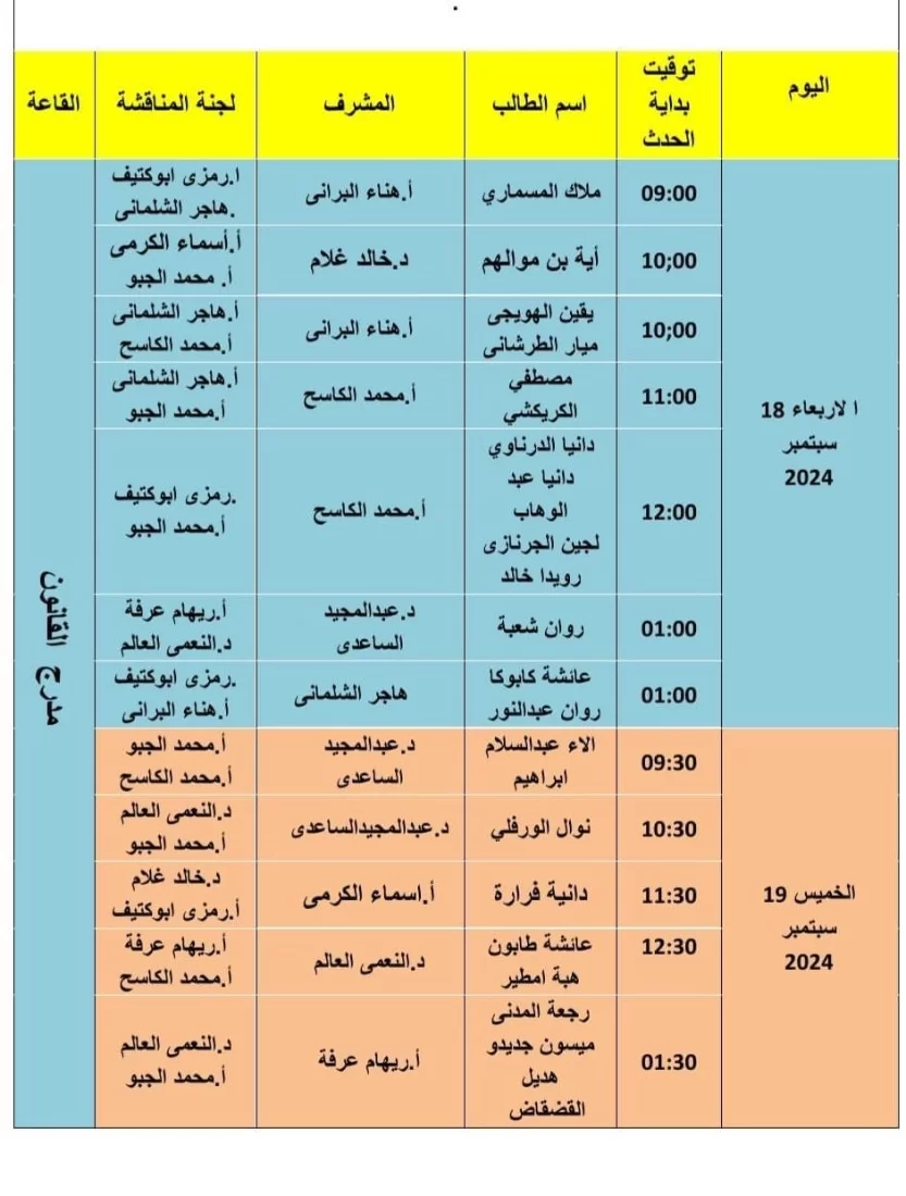 جدول المناقشات ليوم الاربعاء والخميس 18 ، 19 سبتمبر لقسم الصحافة + قسم العلاقات العامة والاعلان.المكان : مدرج القانون .تبداء المناقشات تمام الساعة 09:00.ملاحظة 1: نظرا لعدد المشاريع التى ستناقش غدا ان شاء الله فان التوقيت الخاص بالمنا