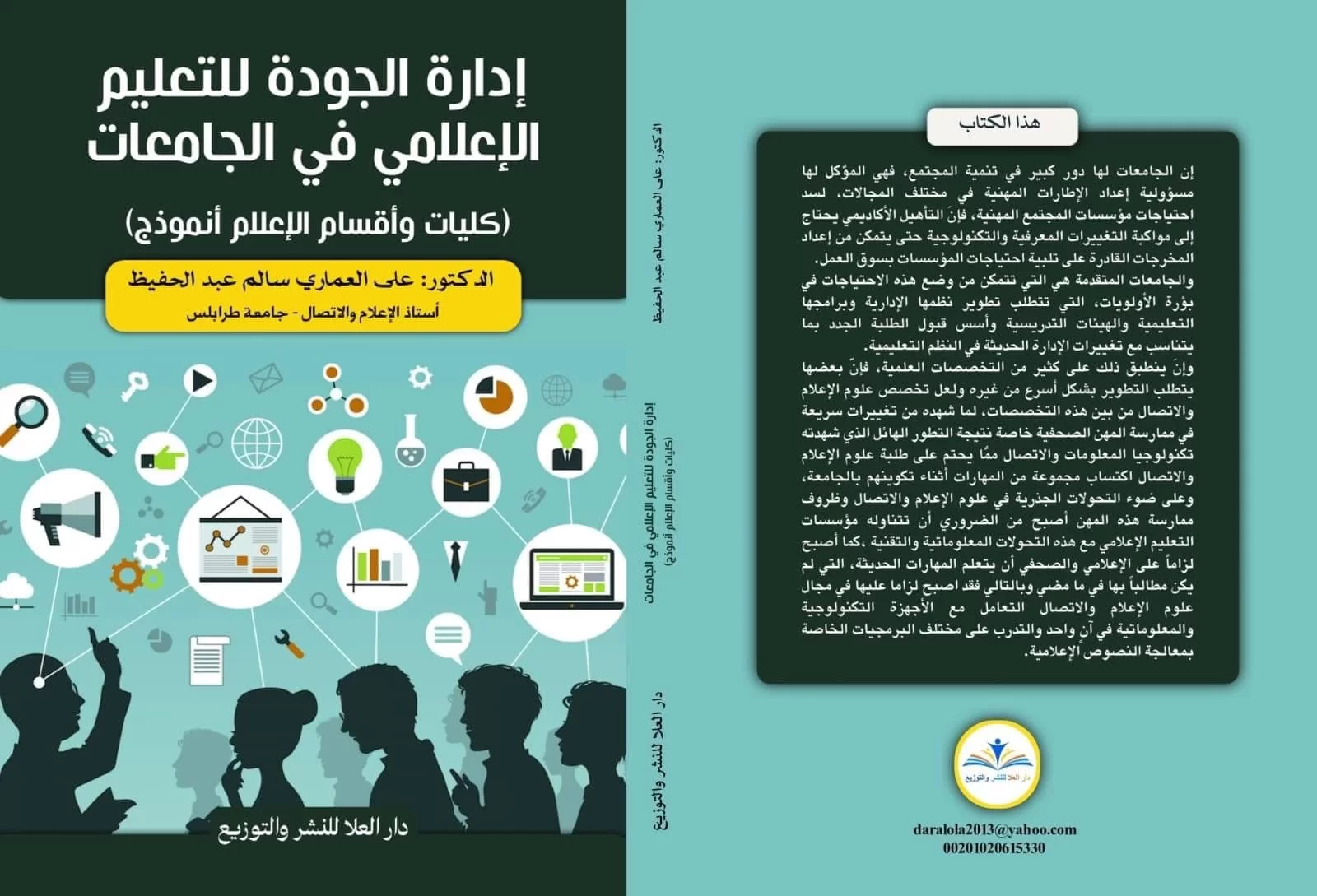 كتاب جديد للدكتور علي العماري، استاذ قسم الإذاعة والتلفزيون ومدير مكتب الجودة وتقييم الأداء بكلية الإعلام والاتصال السابق. حيث صدر له كتاب جديد عن دار العلا للنشر والتوزيع بعنوان: إدارة الجودة للتعليم الإعلامي بالجامعات، كليات وأقسام الإعلام أنموذجا، والذي سيتم عرضه بمعرض الصالون الدولى للكتاب با