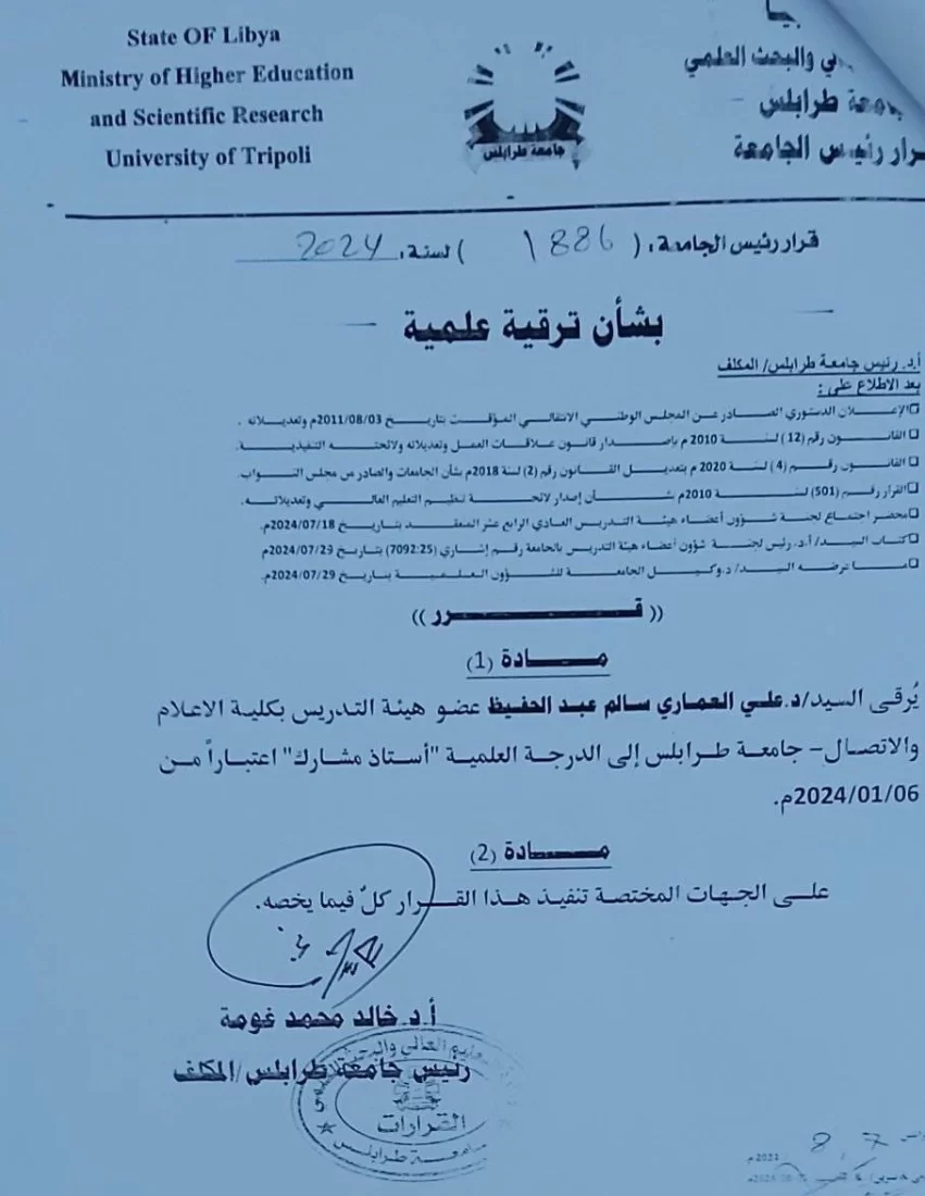 نتقدم بأحر التهاني والتبريكات للدكتور علي العماري سالم، عضو هيئة التدريس بقسم الإذاعة والتلفزيون، بمناسبة ترقيته إلى درجة أستاذ مشارك.الف مبارك وعقبال الاستاذية.