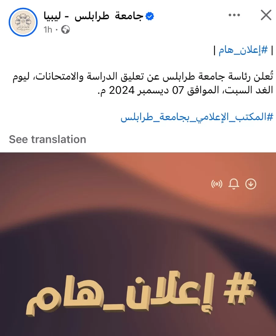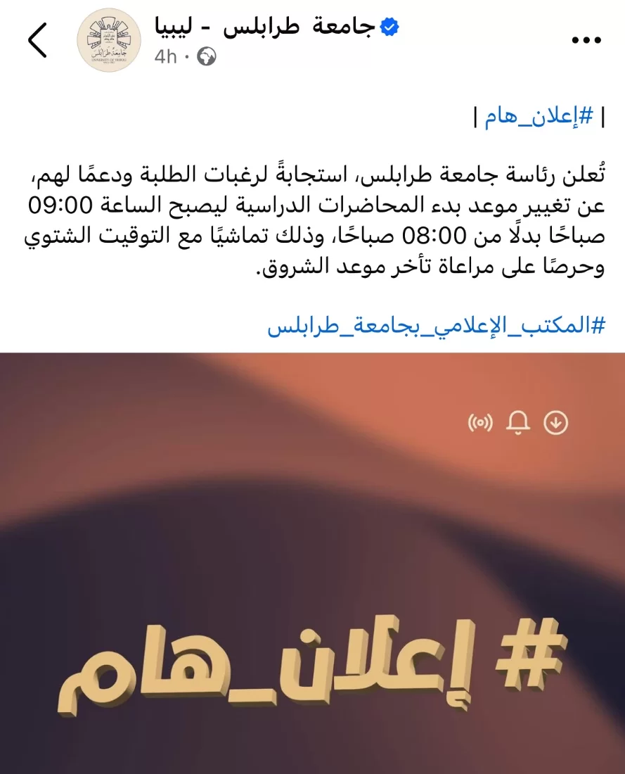 | #إعلان_هام |تُعلن رئاسة جامعة طرابلس، استجابةً لرغبات الطلبة ودعمًا لهم، عن تغيير موعد بدء المحاضرات الدراسية ليصبح الساعة 09:00 صباحًا بدلًا من 08:00 صباحًا، وذلك تماشيًا مع التوقيت الشتوي وحرصًا على مراعاة تأخر موعد الشروق.#المكتب_الإعلامي_بجامعة_طرابلس