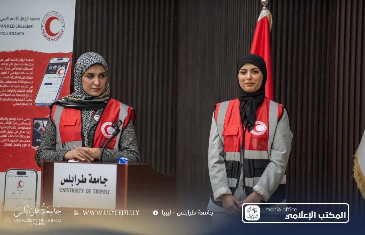 أقيمت صباح اليوم الاثنين، الموافق 09 ديسمبر 2024 م، ندوة علمية بعُنوان "الهلال الأحمر الليبي تاريخ من التضحية وعزم لا ينكسر في مواجهة الأزمات " في مدرج رشيد كعبار بجامعة طرابلس.أدارت الندوة طالبتا كلية الإعلام والاتصال، ملاك عبدالسلام وسجى جمال، تحت إشراف السيدة أ. هاجر الشلمان
