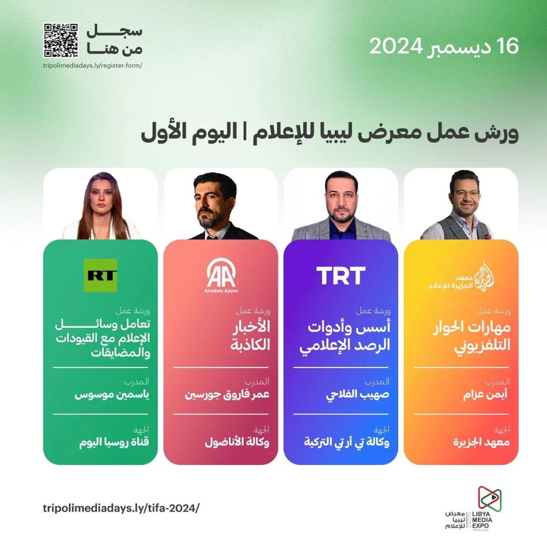 طرابلس من 16 حتى 19 من ديسمبر الحالي، الحدث الإعلامي الأبرز في ليبيا، "#أيام_طرابلس_الإعلامية" والذي يشهد إقامة مجموعة من ورش العمل والتدريب والتي تستمر خلال 3 أيام متواصلة، يقدمها نخبة من الصحفيين العالمين بمعهد الجزيرة للإعلام ووكالتي TRT ، وقناة روسيا اليوم ووكالة نوفا وجامعة لويس الإيطا
