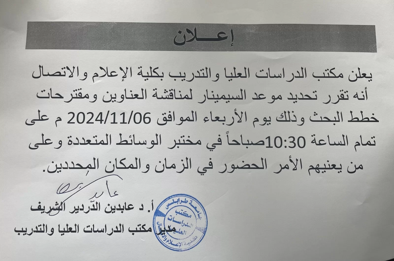 اعلن مكتب الدراسات العليا والتدريب عن موعد مناقشة العناوين والخطط البحثية لطلبة الدراسات العليا والذي سيكون يوم الاربعاء الموافق 6-11-2024 الساعة 10:30 صباحا بمختبر الوسائط المتعددة.