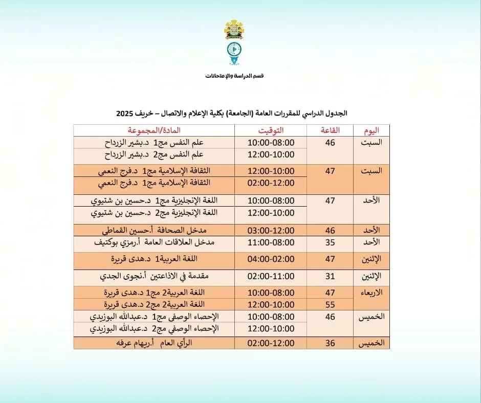 الجدول الدراسي للمقررات العامة للفصل الدراسي خريف 2025
