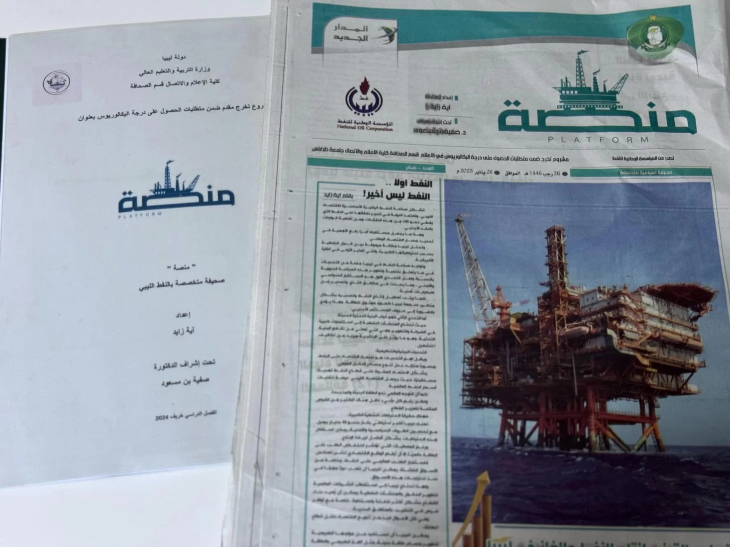 منصة هو عنوان مشروع الطالبة آية زايد المقيدة بقسم الصحافة والذي تم مناقشته اليوم الاثنين بقاعة مكتبة الكلية، المشروع عبارة عن جريدة ورقية من 12 صفحة تتعلق بأخبار النفط والغاز في ليبيا، حيث احتوت الصحيفة على مواضيع مختلفة ومتنوعة من أخبار ومقالات وتقارير ومقابلات، هذا وتكونت لجنة المناقشة من رئيس