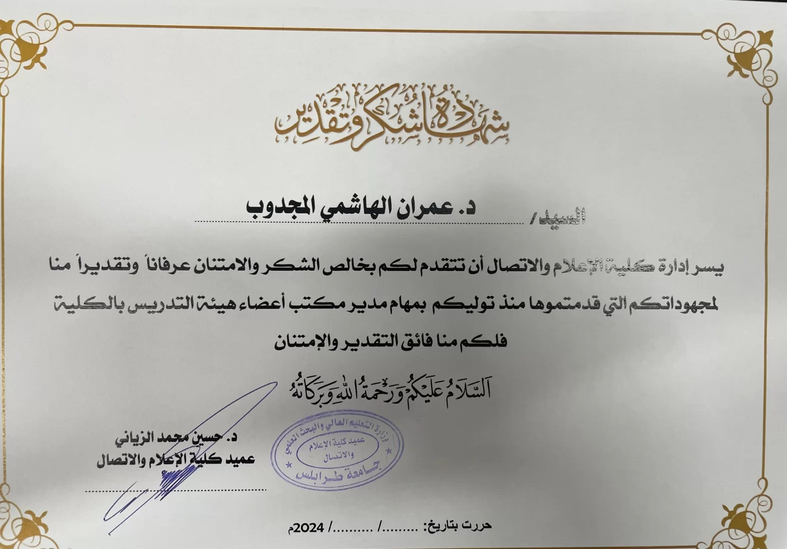 وجرى التكريم بحضور عدد من أعضاء هيئة التدريس وزملاء العمل، حيث قام السيد عميد الكلية الدكتور حسين الزياني بتقديم شهادة تقدير للدكتور عمران نظير مجهوداته طيلة فترة رئاسته للمكتب، وقد عبر الحضور عن امتنانهم وتقديرهم لمجهوداته التي أثرت في تطوير العمل ورفع مستوى الأداء.