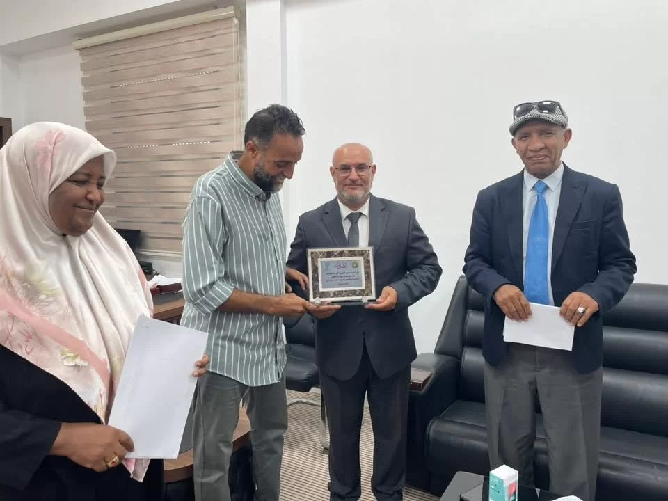 وفي ختام المراسم، قدّم مدير الشؤون الإدارية والمالية بالكلية، الأستاذ عبدالسلام عشيش، درعًا تذكاريًا باسم موظفي الكلية إلى الدكتور حسين، عرفانًا وتقديرًا لجهوده، متمنين له دوام السداد والتوفيق.